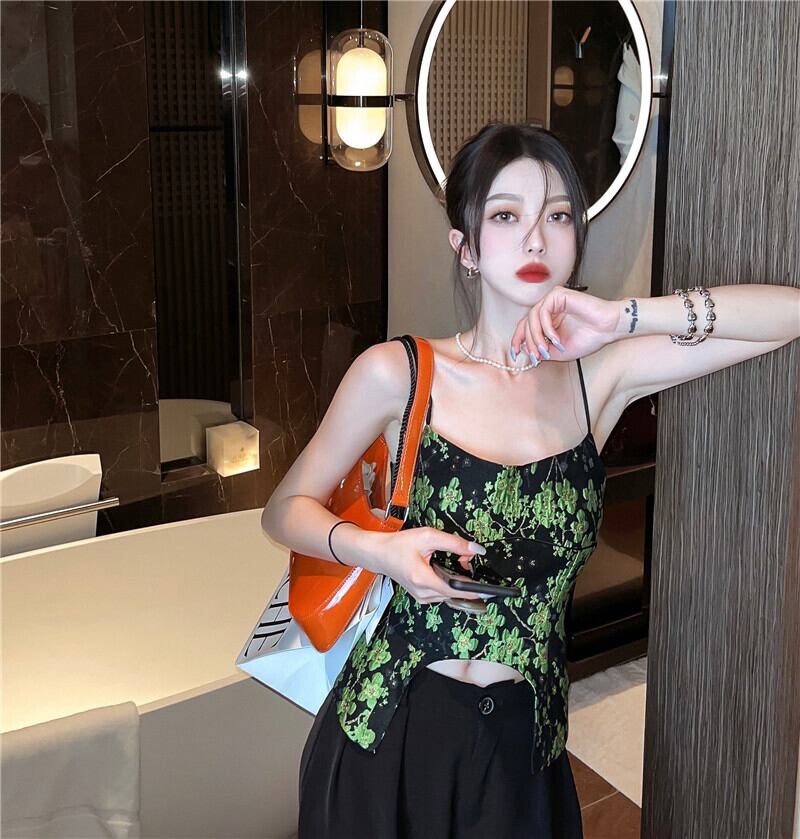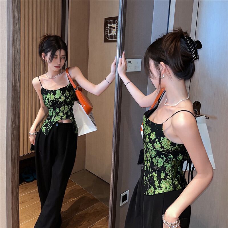 Heavy industry floral camisole women's outer wear trendy summer 2022 new split backless lace-up short top ショート レース サマー 夏物 花柄 レースアップ 0921917801104590