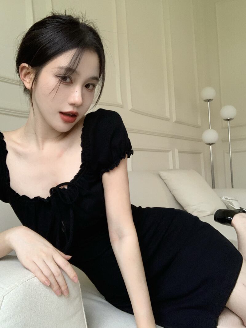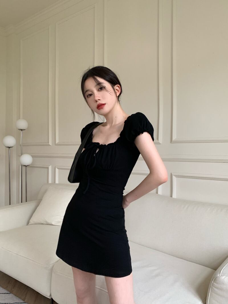 Sexy black short-sleeved dress women's summer 2022 new lace-up hollow square neck waist slim bag hip skirt ブラック レース サマー 夏物 スカート スリム レースアップ スクウェア 0921918506757659
