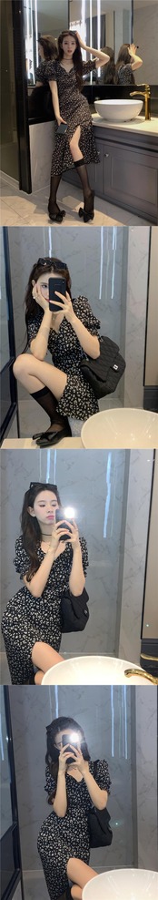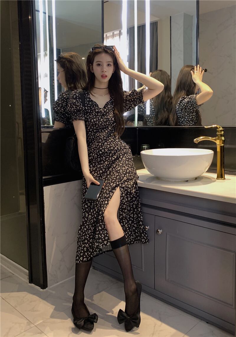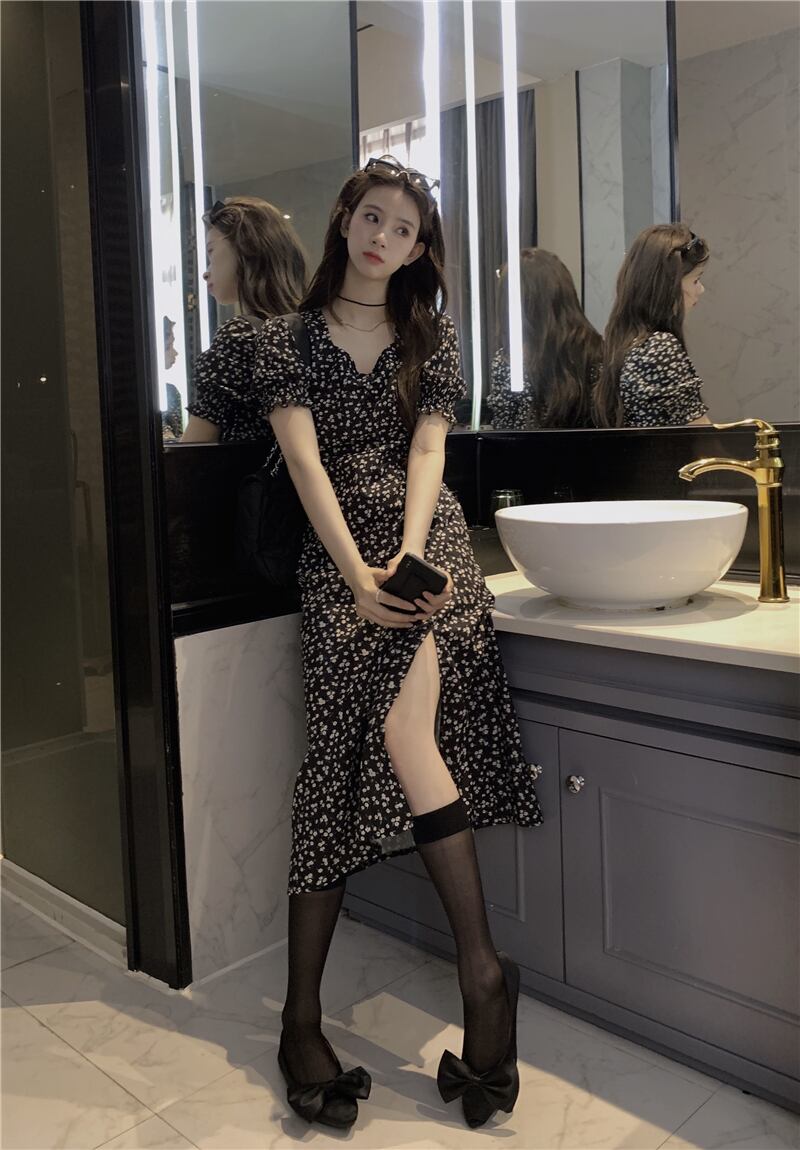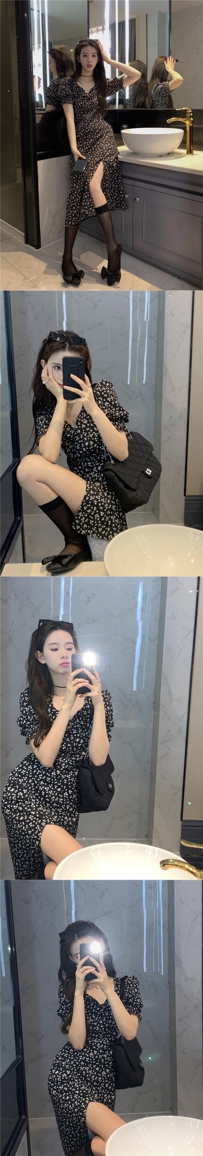 French v-neck floral dress women's high-end summer 2022 new waist mid-length split tea break skirt サマー 夏物 花柄 スカート Vネック 0921942611664876