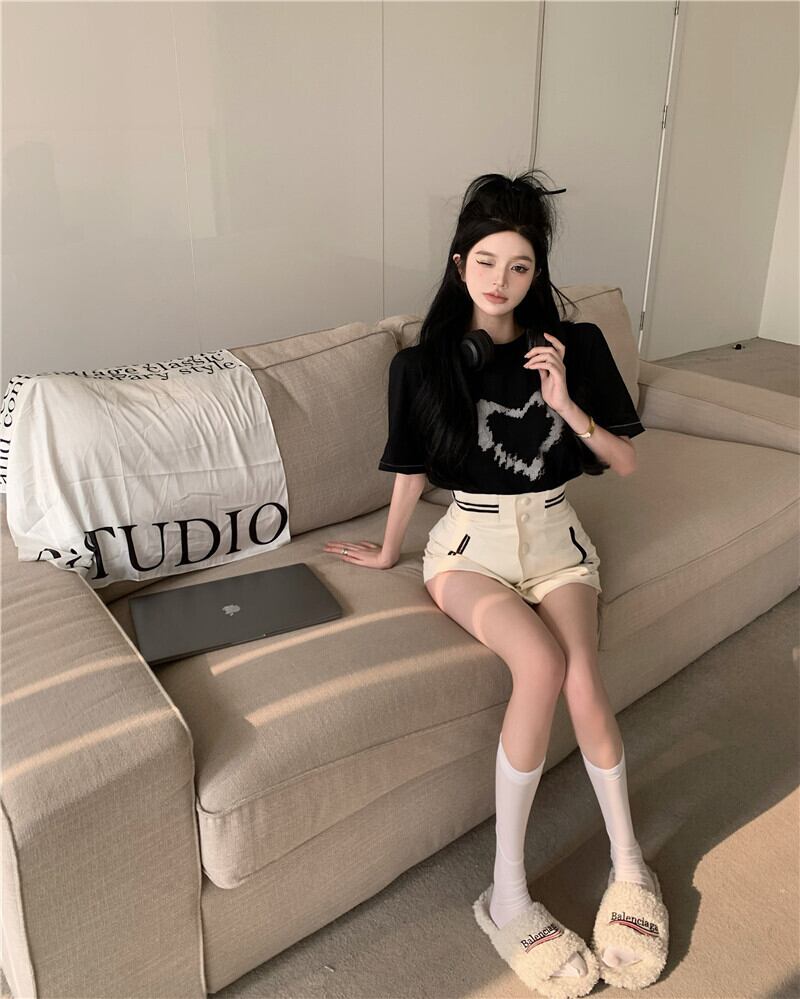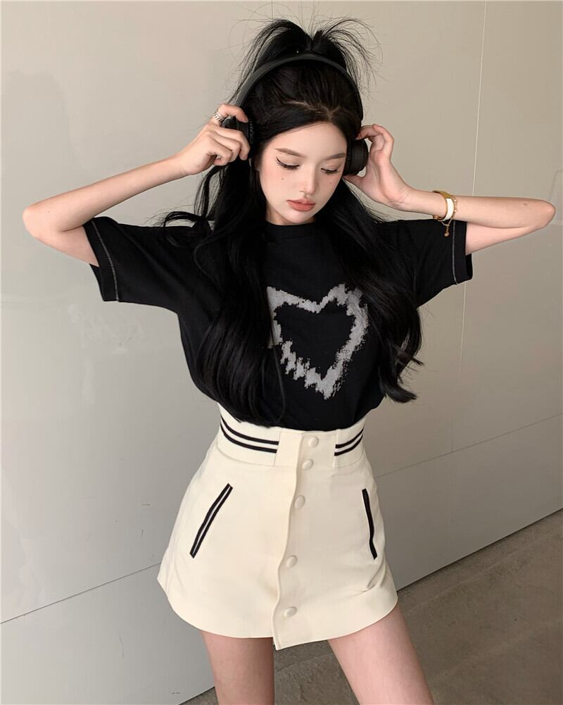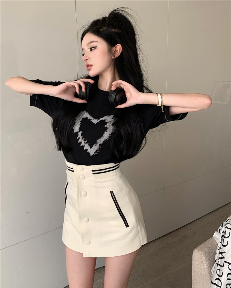 sense personality love print black short-sleeved T-shirt women's summer 2022 new style fashion loose top ブラック サマー 夏物 Tシャツ 0921914127831094