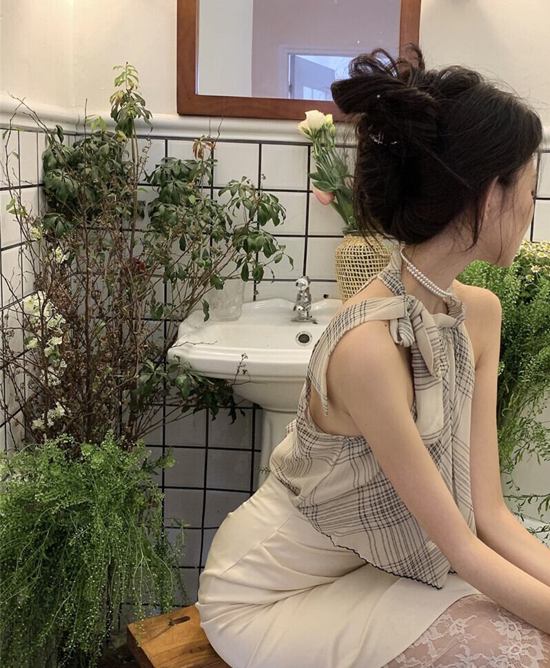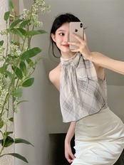 French plaid bandage sleeveless chiffon shirt women's summer 2022 new design sense of small all-match thin top シフォン サマー 夏物 ノースリーブ 0921988482111002