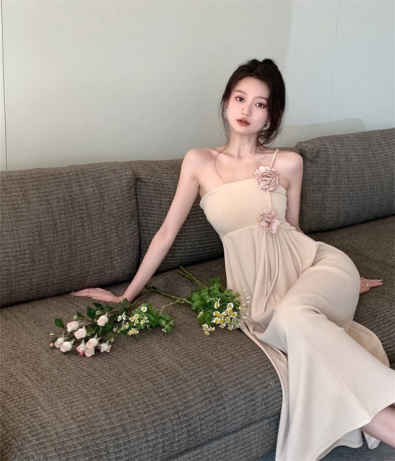 Gentle wind three-dimensional flower suspender dress female summer 2022 new pleated waist mid-length A-line skirt プリーツ サマー 夏物 スカート Aライン フラワーデザイン 0921999437352497