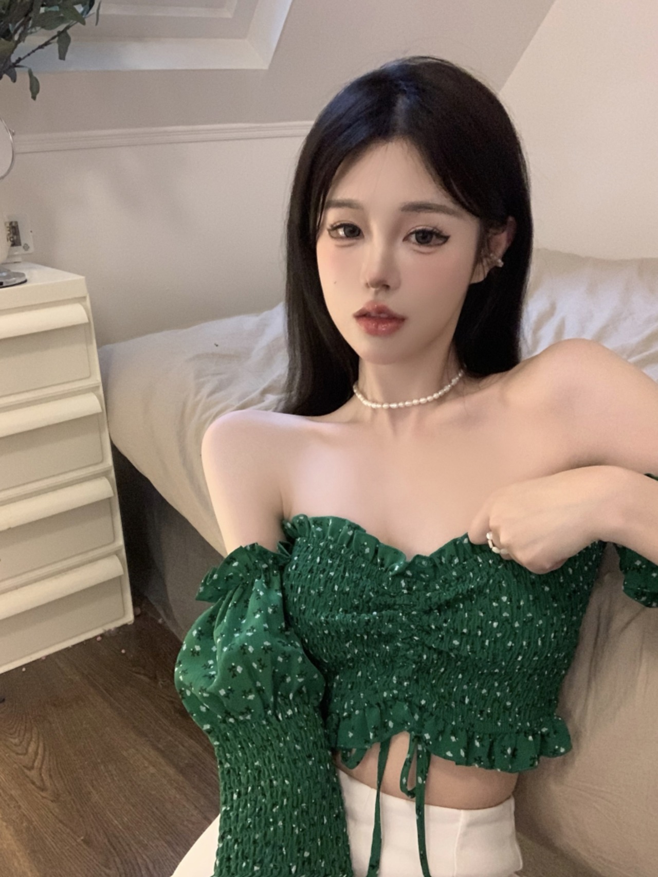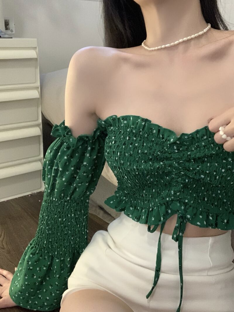 Pure desire to reveal collarbone green floral shirt women's summer 2022 new drawstring fungus edge short top trendy ショート サマー 夏物 花柄 グリーン 09219561034500