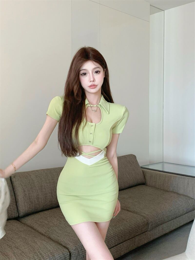 Sexy hollow polo collar short-sleeved dress women's summer 2022 new chic temperament waist slim hip skirt サマー 夏物 スリムヒップ スカート スリム 0921970832720081