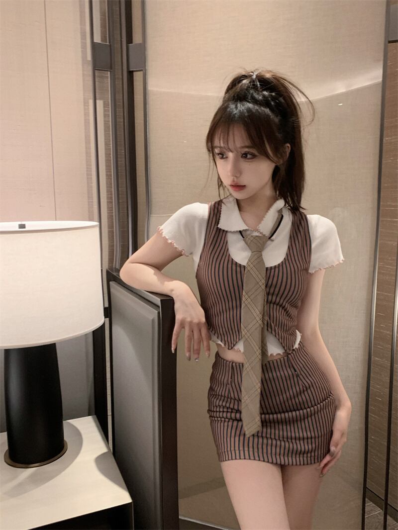 American striped fashion suit female summer 2022 new temperament short vest bag hip skirt two-piece set ショート サマー 夏物 スカート ストライプ 0921921167049121