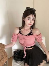 Sweet and spicy fake two-piece pink halter short-sleeved T-shirt women's summer 2022 new chic fungus edge short top ショート ピンク 大人ガーリー スウィート キュート カジュアル サマー 夏物 Tシャツ 0921970566752696
