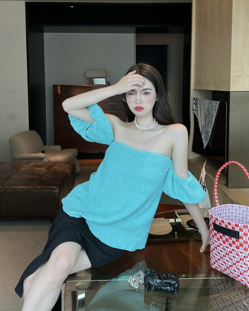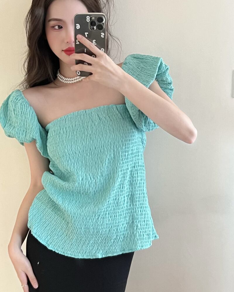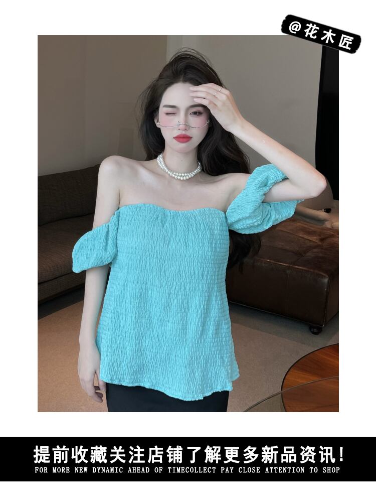 Blue puff sleeve one-shoulder shirt women's summer 2022 new design niche chic pleated short top ショート ブルー プリーツ サマー 夏物 0921964341457349