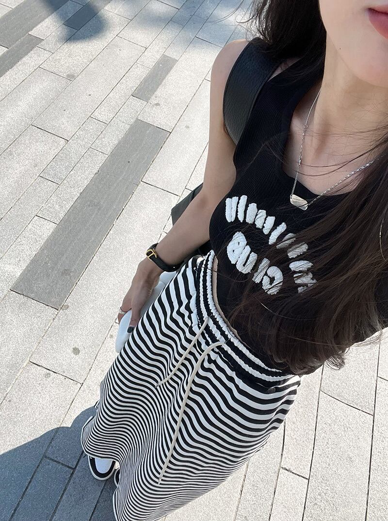 Net red striped split skirt women's summer 2022 new design small drawstring high waist slim A-line skirt ハイウェスト レッド サマー 夏物 スカート Aライン ストライプ スリム 0921991840884830