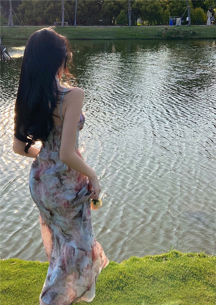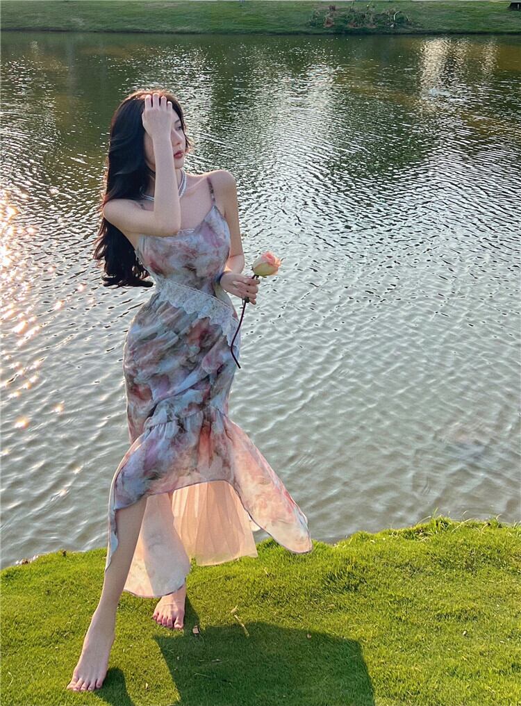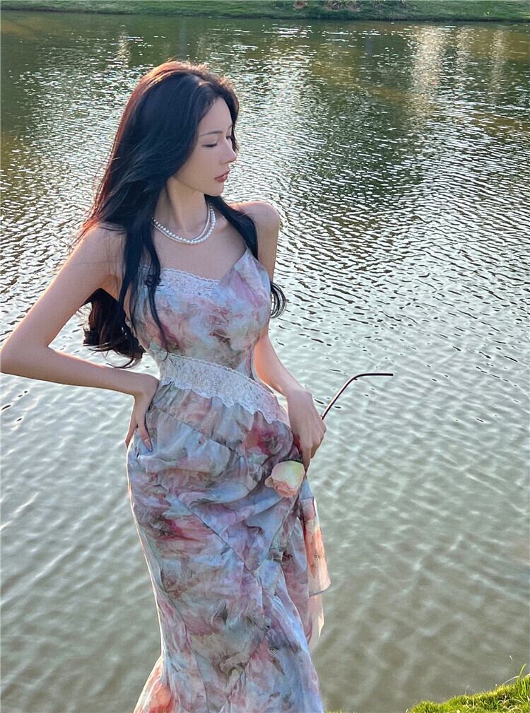 French lace stitching oil painting floral dress female summer 2022 new holiday mid-length waist mermaid skirt レース サマー 夏物 花柄 スカート ステッチ 0921990047755463