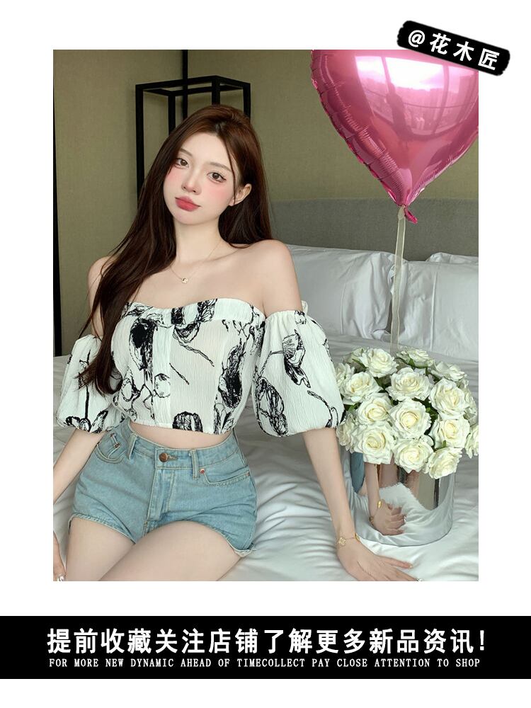 French print one-shoulder top women's summer 2022 new design niche slim short puff sleeve shirt ショート サマー 夏物 スリム 0921994987352992