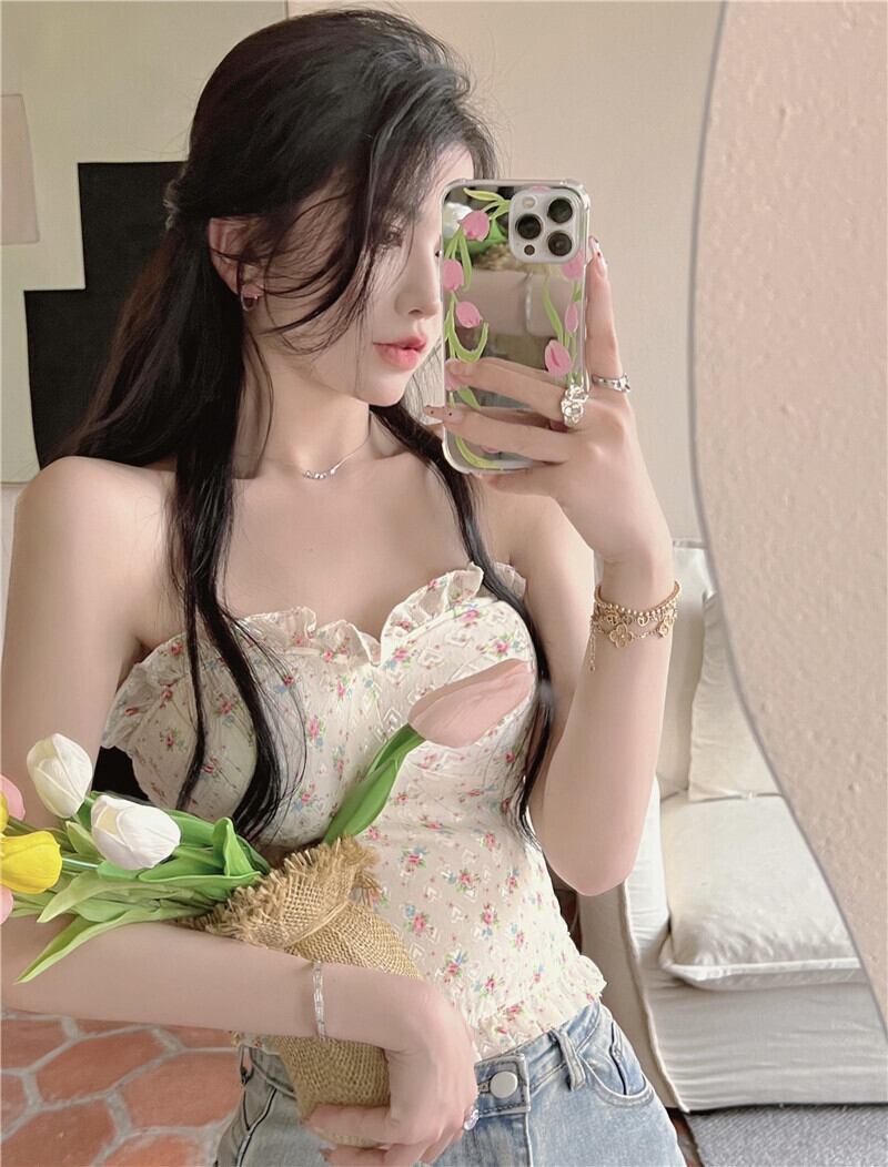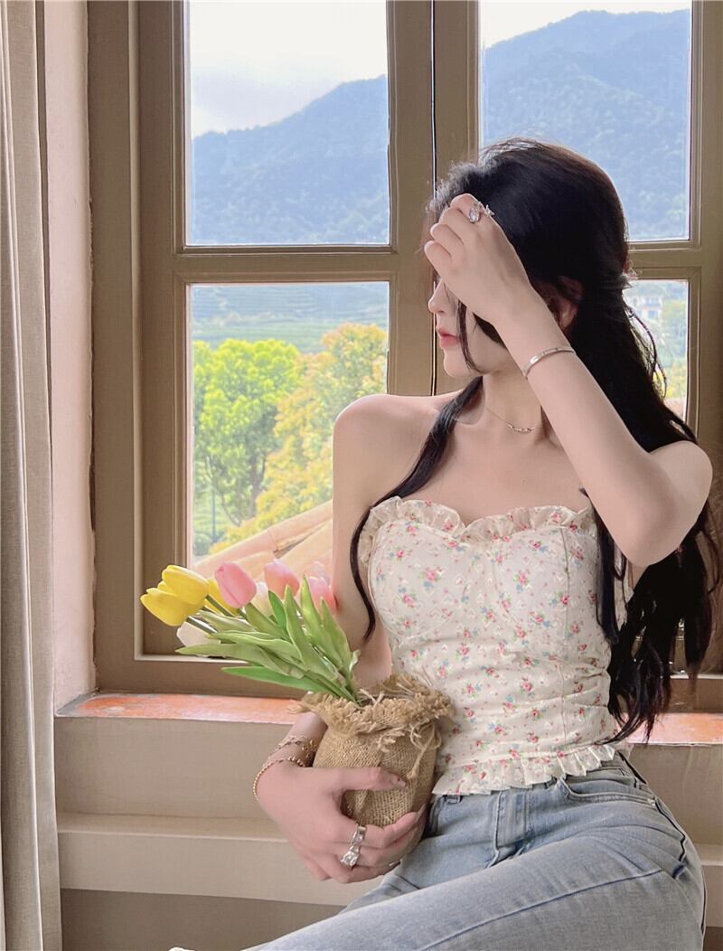 French floral tube top top women's summer outer wear 2022 new chic fungus edge slim short vest outer wear ショート サマー 夏物 花柄 スリム 0921979317916532