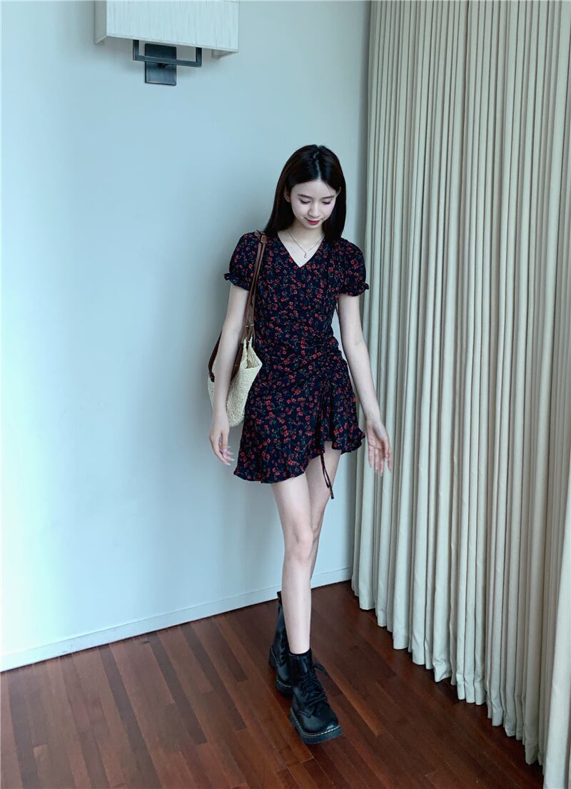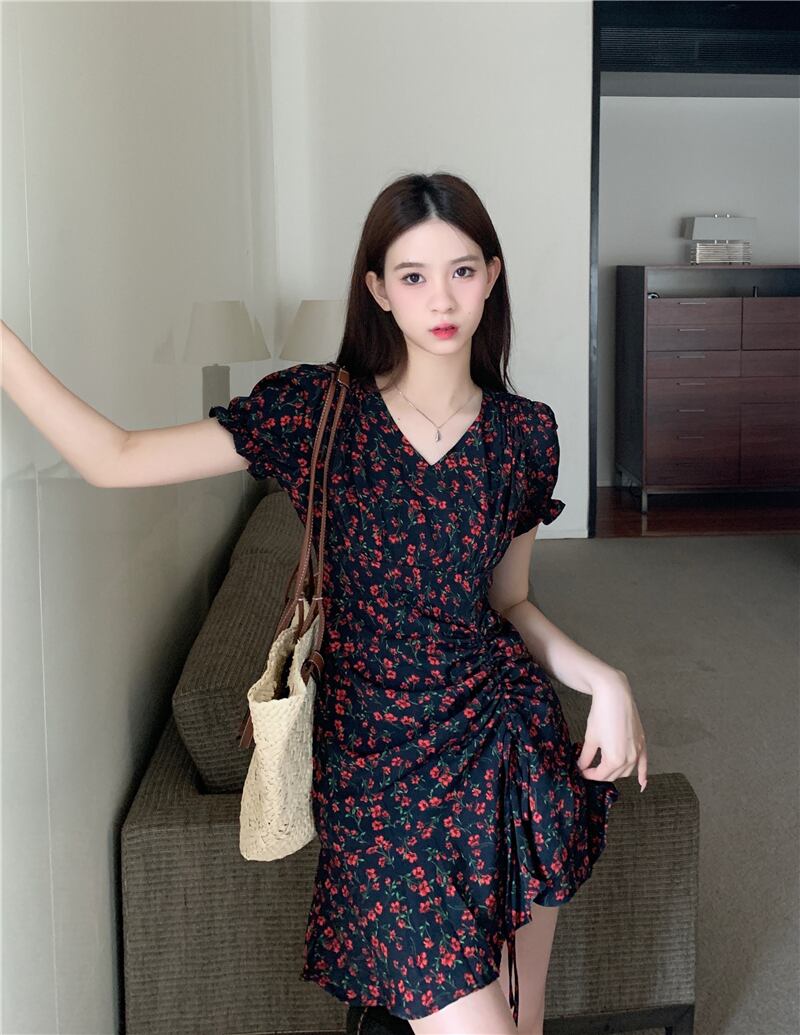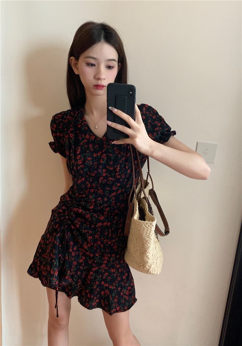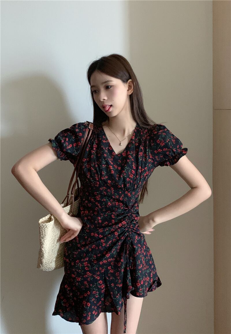 Sweet and spicy style V-neck floral dress women's summer 2022 new drawstring temperament puff sleeves waist A-line skirt 大人ガーリー スウィート キュート カジュアル サマー 夏物 花柄 スカート Vネック Aライン 0921972355857743