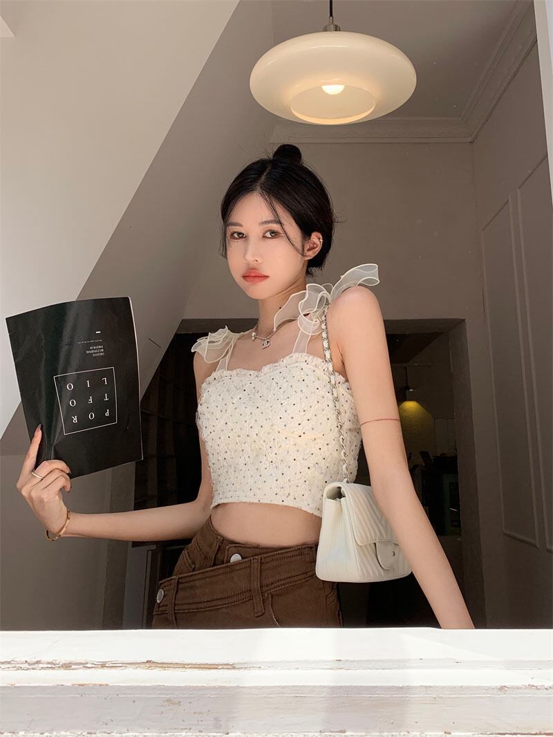 Chic stitching mesh polka dot camisole women's outer wear trendy summer 2022 new sweet and spicy slim short top ショート 大人ガーリー スウィート キュート カジュアル サマー 夏物 メッシュ スリム ステッチ 0921998828623785