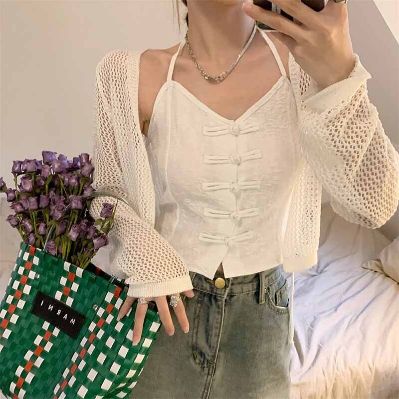 Retro disc buckle halter neck camisole women's inner wear summer 2022 new slim chic white short top trendy ショート ホワイト レトロ サマー 夏物 スリム 0921964066284524