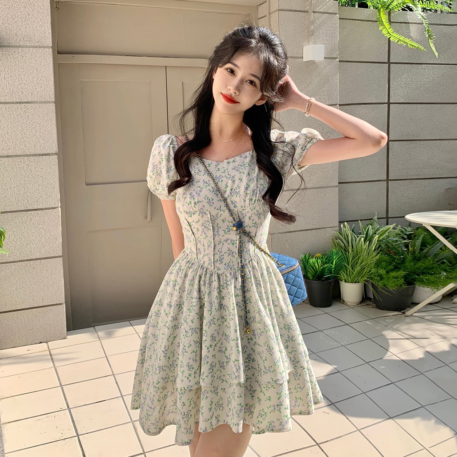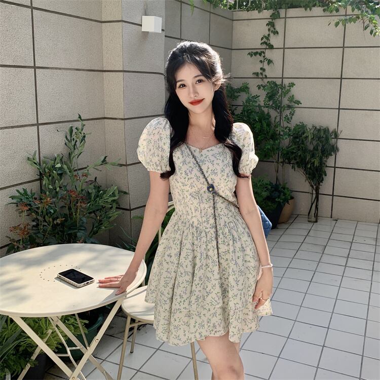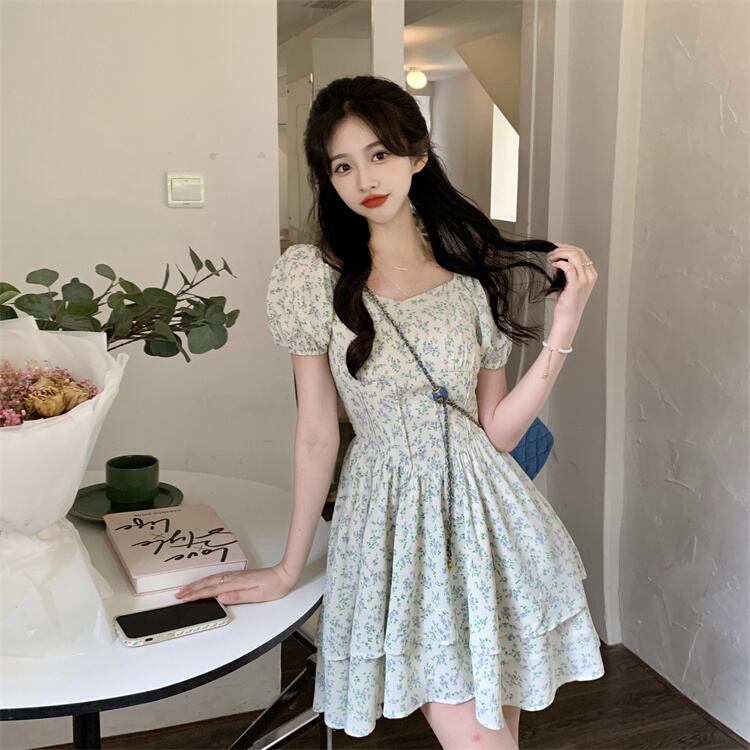 French temperament V-neck puff sleeve floral dress women's summer 2022 new temperament waist slim cake skirt サマー 夏物 花柄 スカート Vネック スリム 0921942641892441