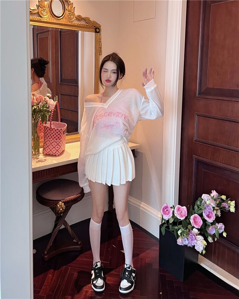 Letter embroidery v-neck sunscreen sweater women's summer 2022 new net red all-match white blouse loose top ホワイト レッド ブラウス 刺繍 サマー 夏物 Vネック 0921924779141878