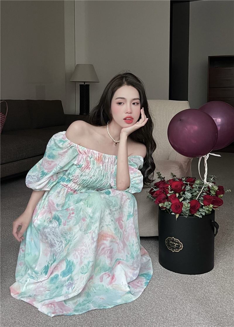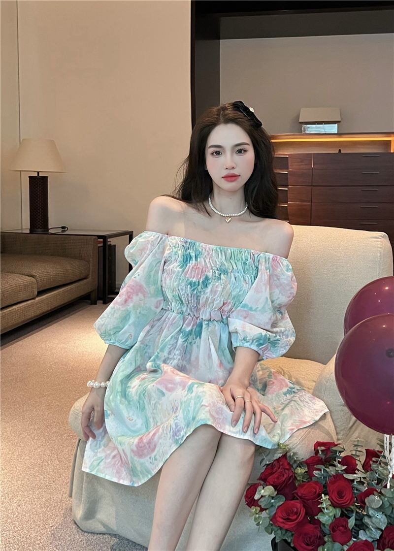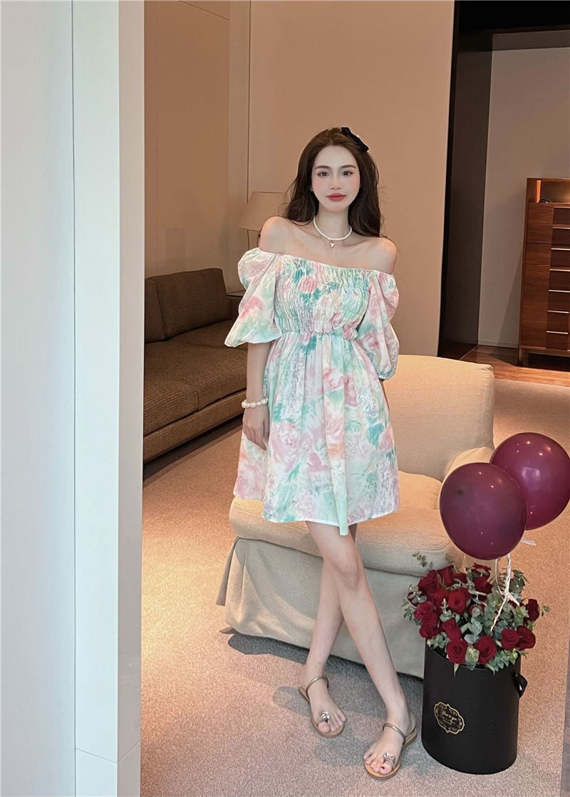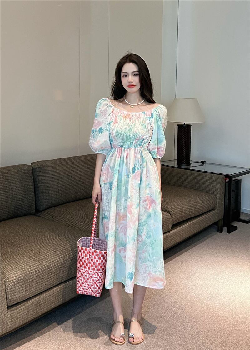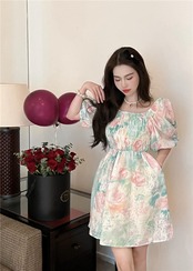 French tea break sweet puff sleeve floral dress women's summer 2022 new temperament square collar waist A-line skirt 大人ガーリー スウィート キュート カジュアル サマー 夏物 花柄 スカート Aライン スクウェア 0921985838685306