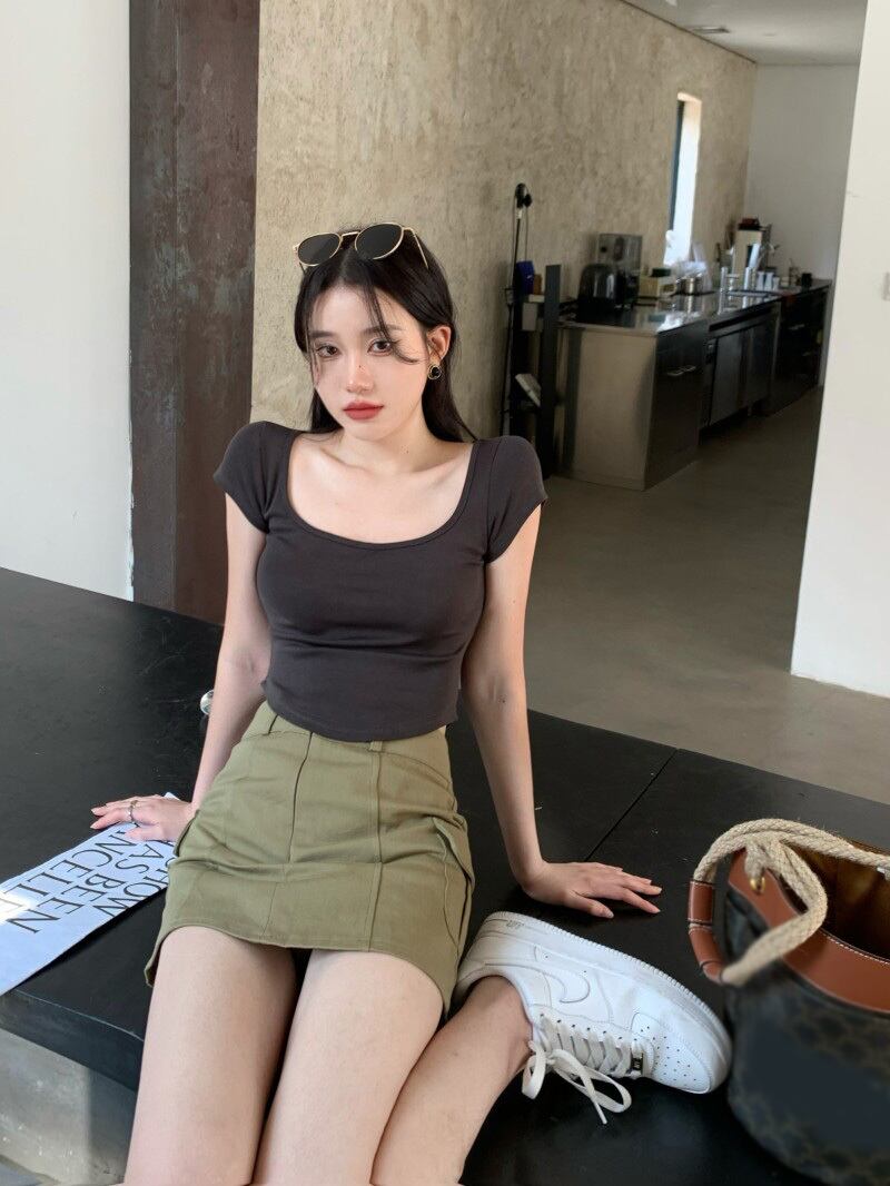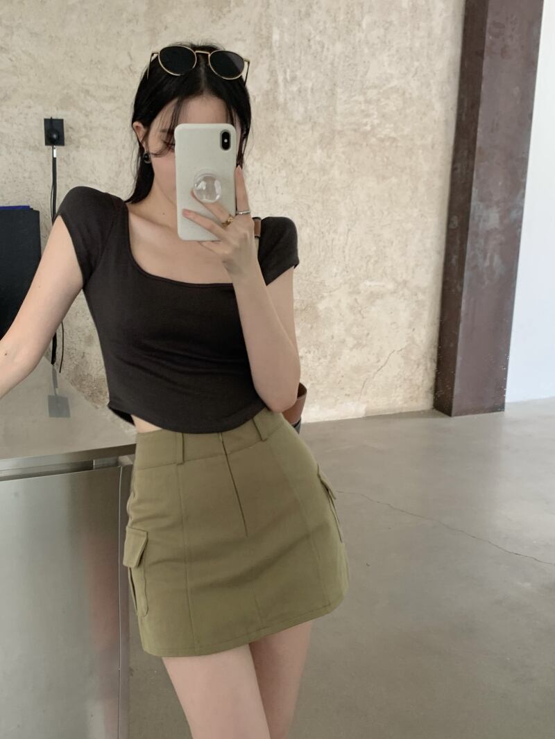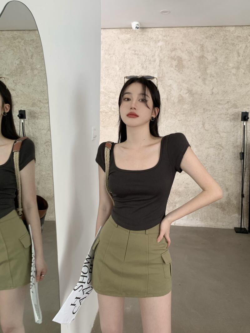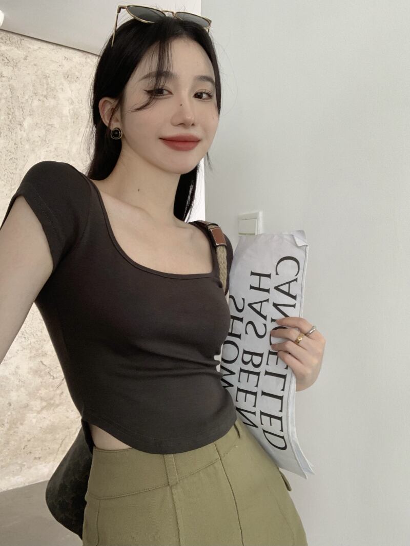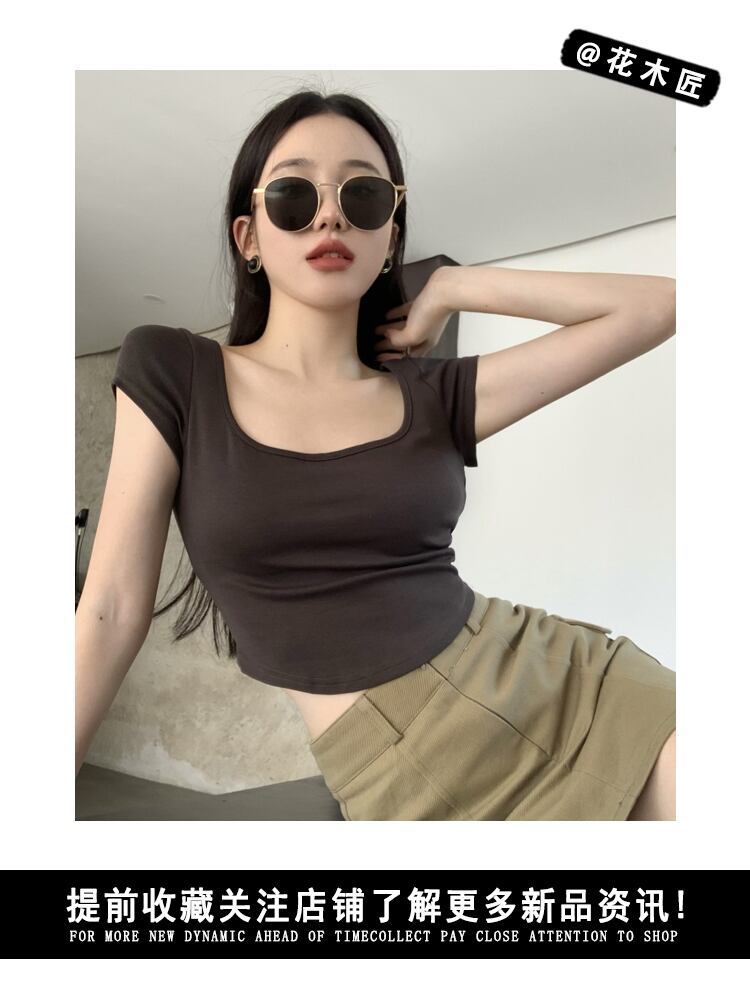 American u-neck short-sleeved t-shirt female ins tide summer 2022 new bottoming shirt slim fit and thin short top ショート サマー 夏物 スリム Tシャツ 0921973660874344