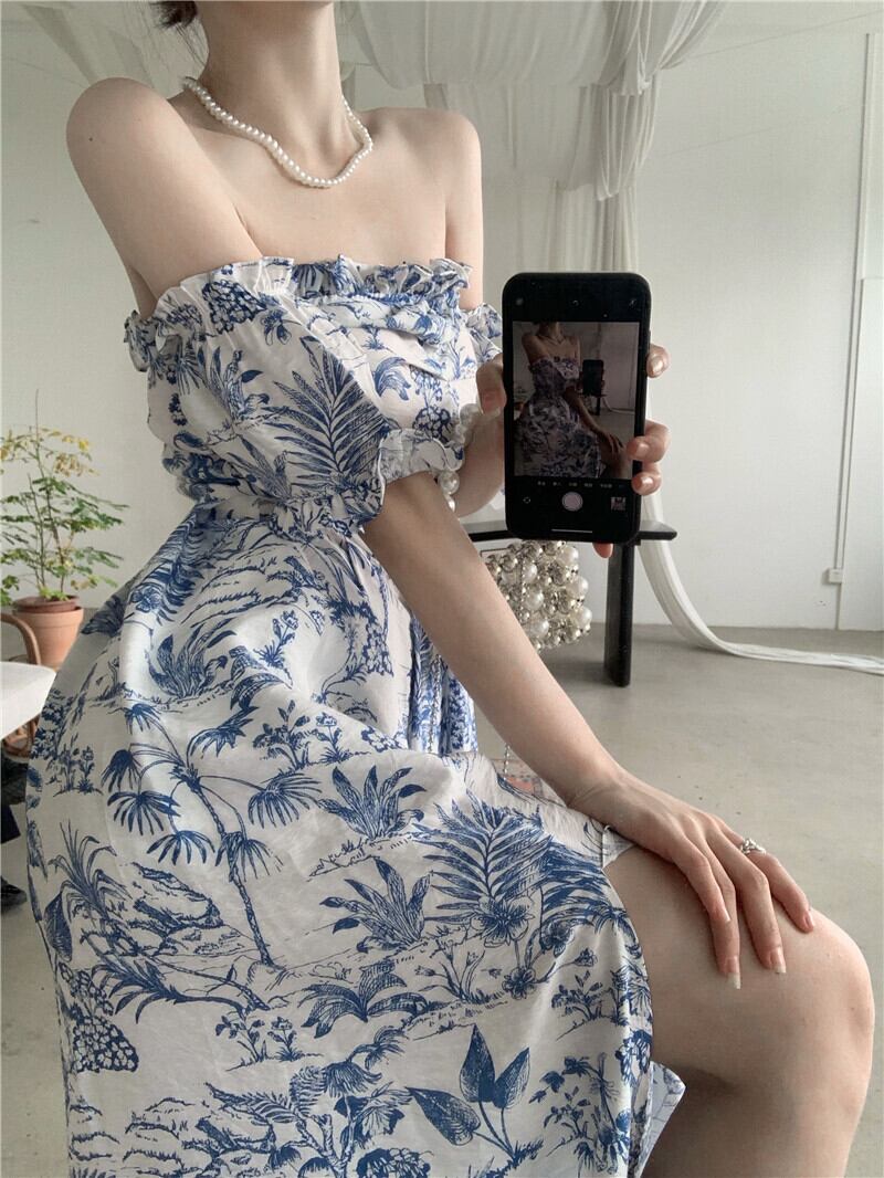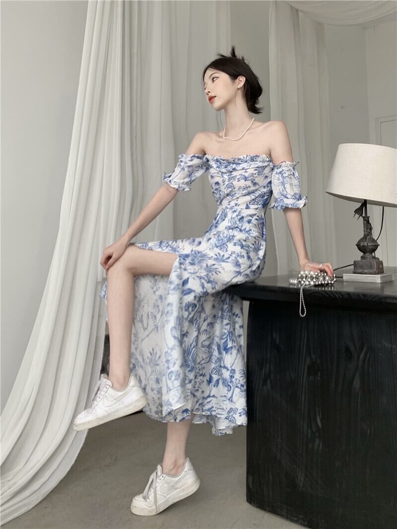 -quality temperament one-shoulder dress women's mid-length summer 2022 new holiday style split waist skirt サマー 夏物 スカート 0921950056111012