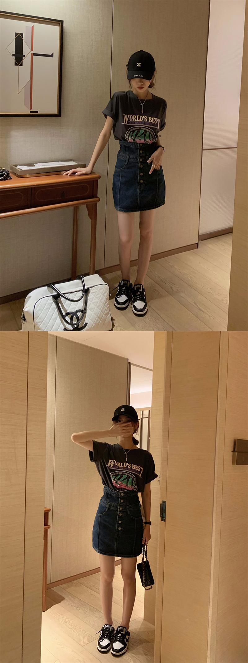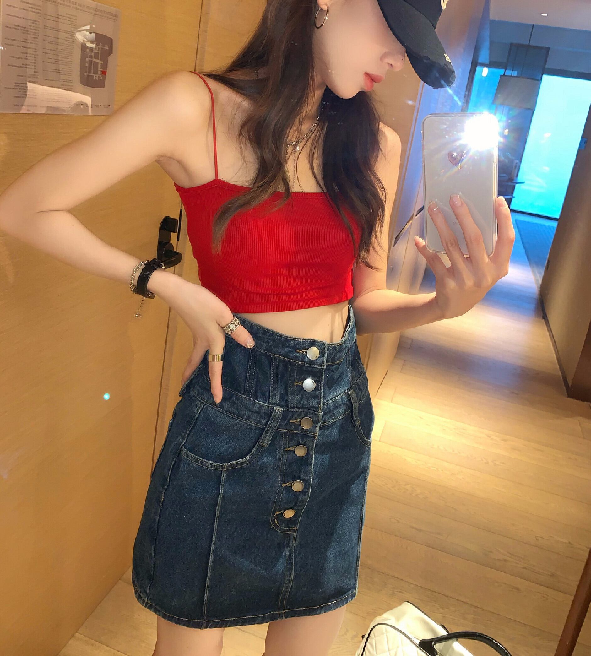 Net red design sense breasted high waist denim skirt women's summer 2022 new small all-match A-line skirt ハイウェスト レッド サマー 夏物 スカート Aライン 0921925872180251