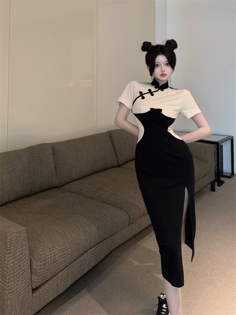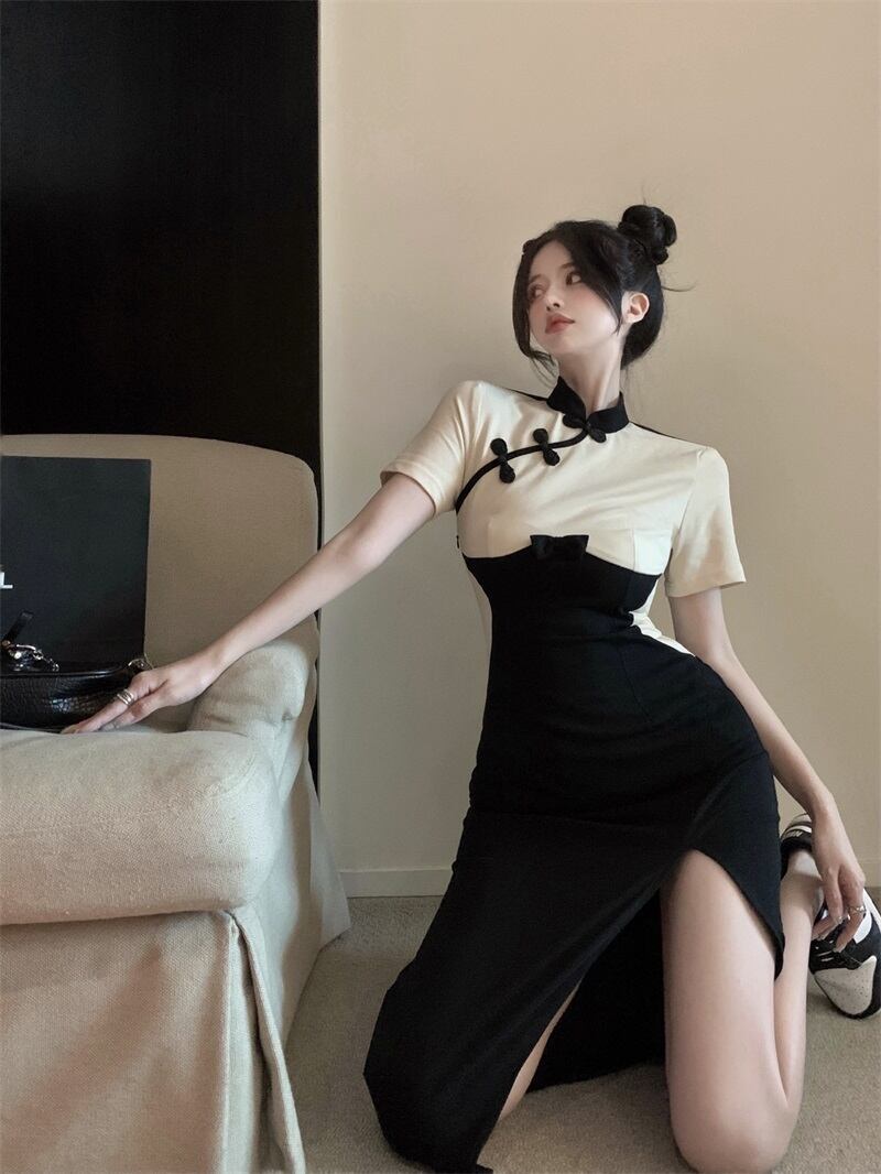 Color matching short-sleeved improved cheongsam dress women's summer 2022 new retro waist mid-length split skirt trendy レトロ サマー 夏物 スカート 092193405353875