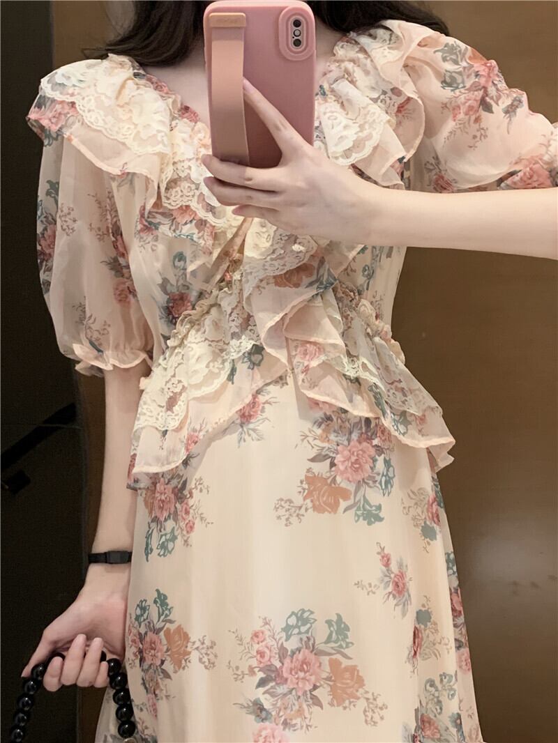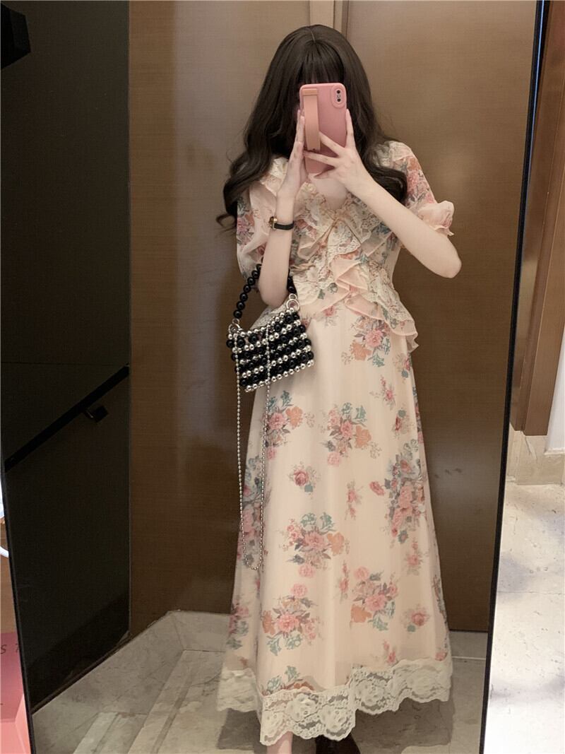 French temperament lace stitching floral dress women's mid-length summer 2022 new waist and thin A-line skirt レース サマー 夏物 花柄 スカート Aライン ステッチ 0921931940723782