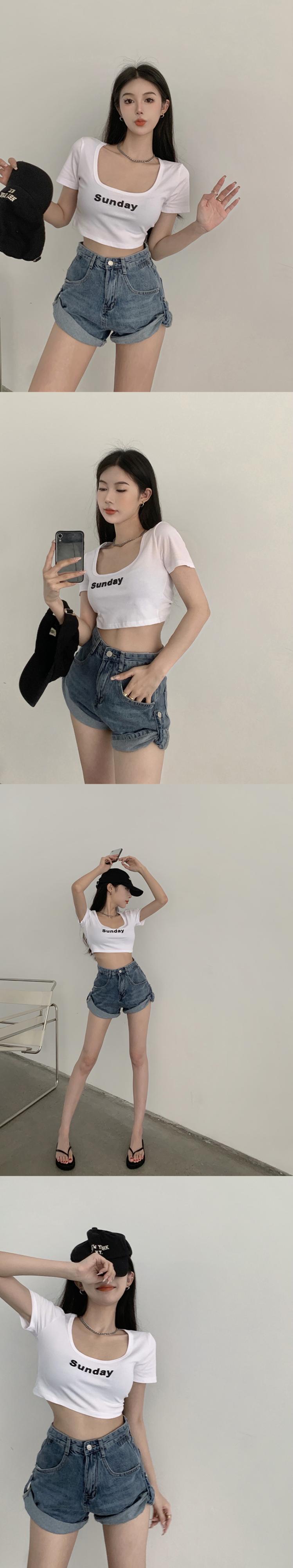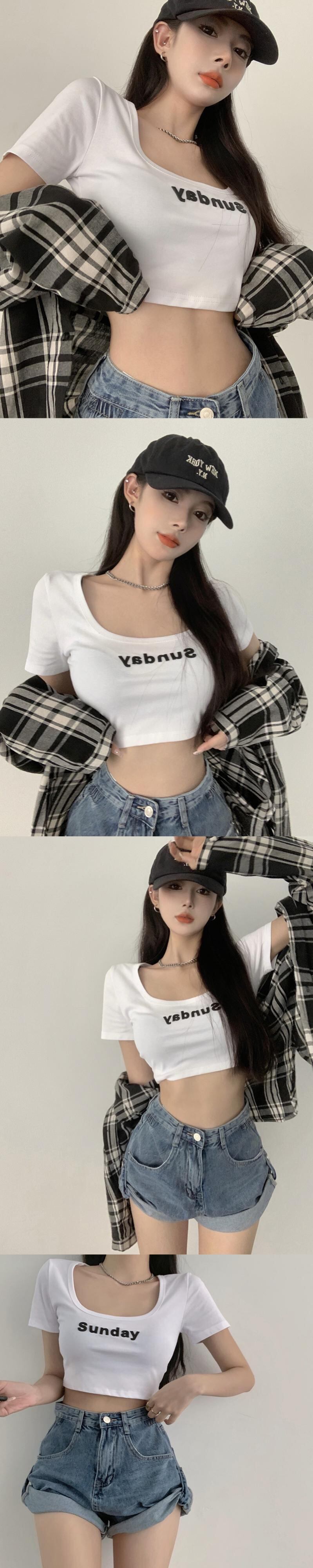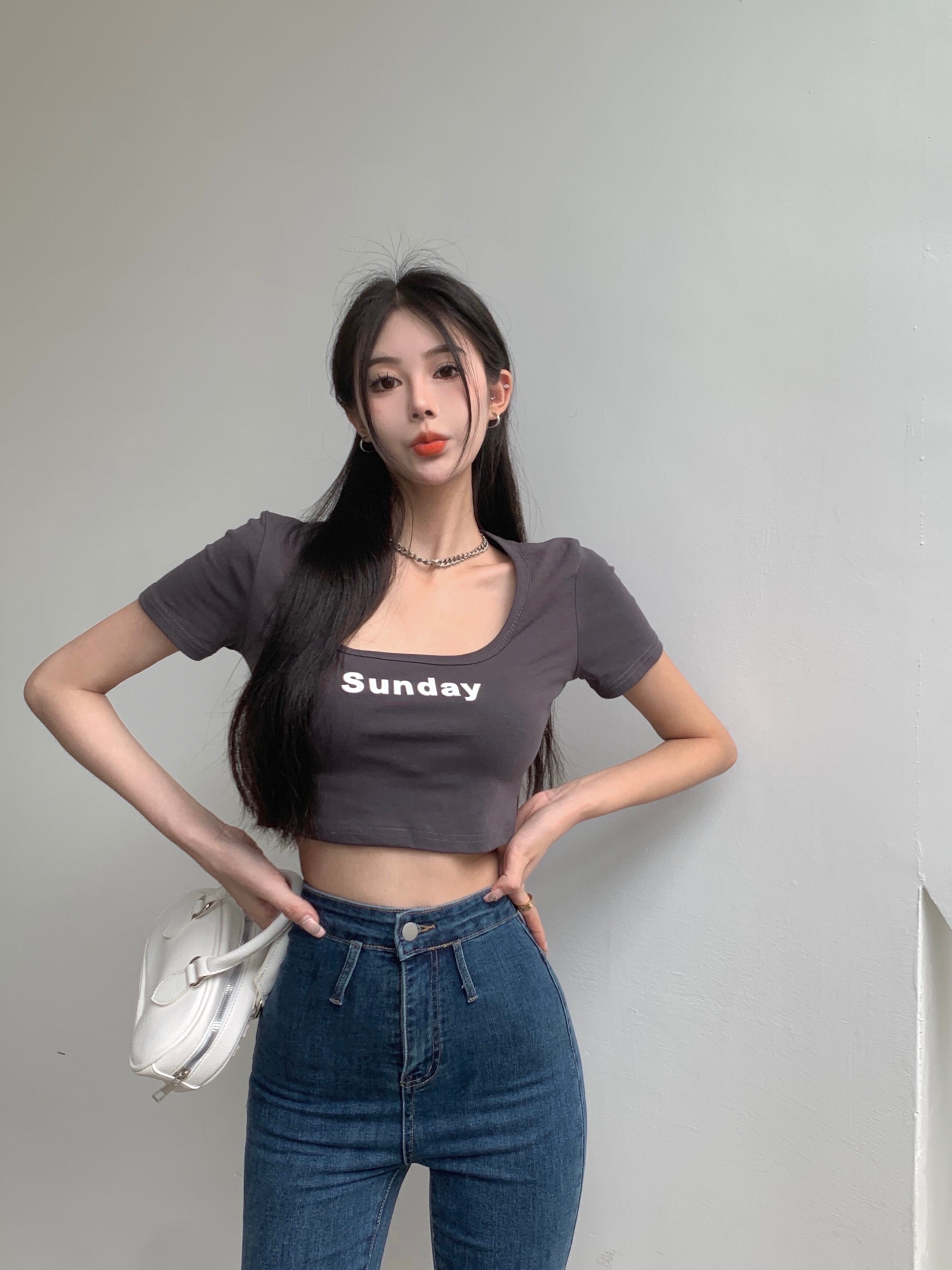 Sexy exposed collarbone square collar short-sleeved T-shirt women's summer 2022 new fashion letter slim short top ショート サマー 夏物 スリム Tシャツ スクウェア 0921979303949712