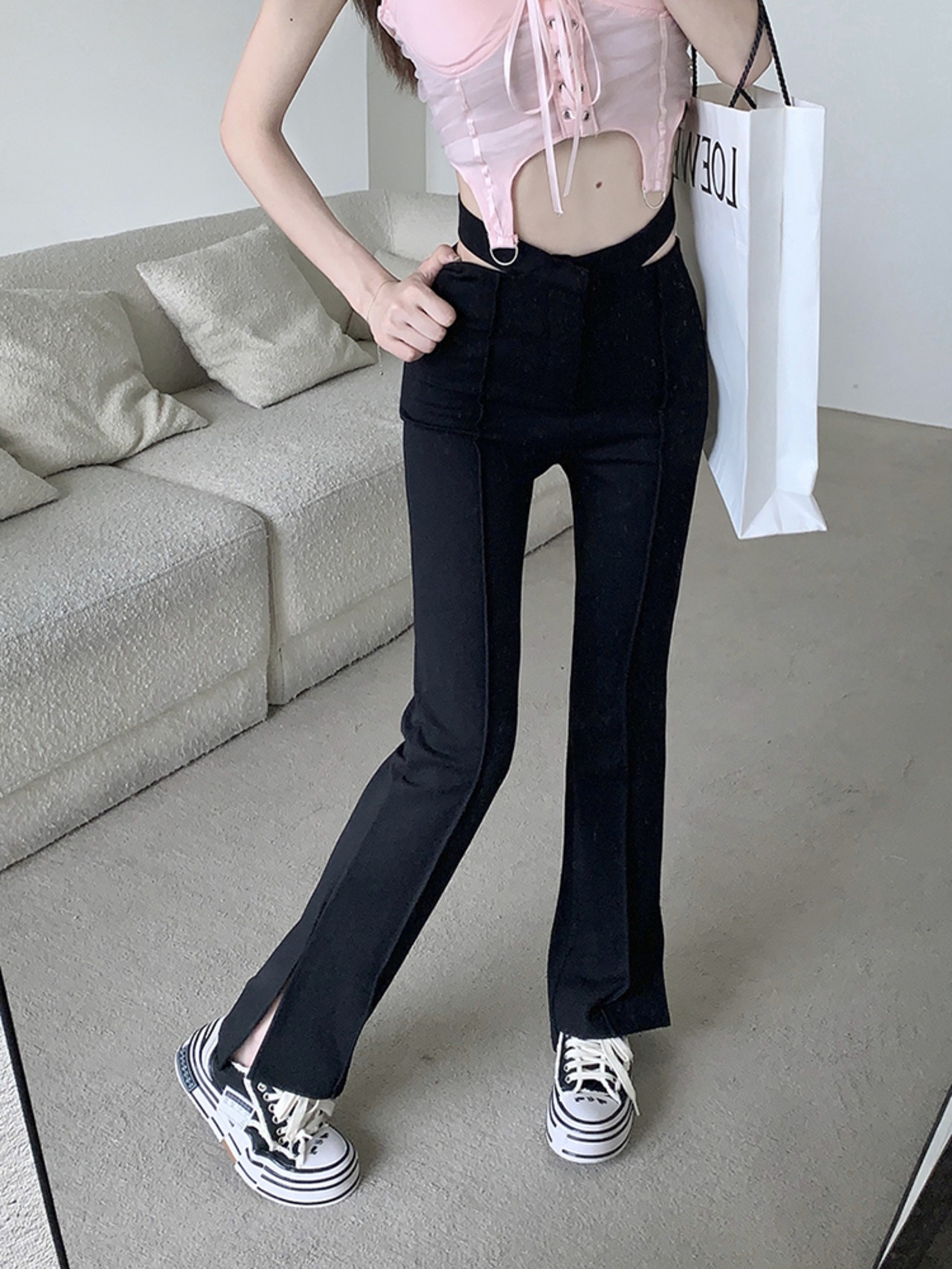 Scheming Hollow Split Black Pants Women's Summer 2022 Slim Fit Micro-Flare Pants Thin Waist Pants ブラック サマー 夏物 スリム 0921962874732244