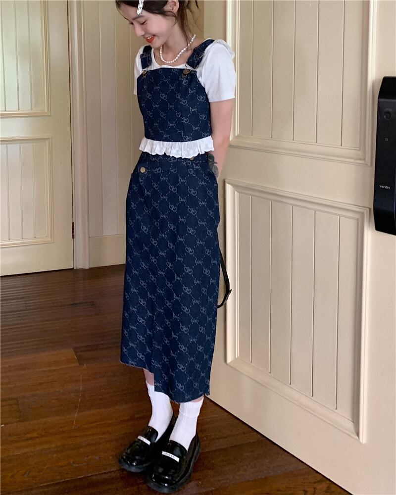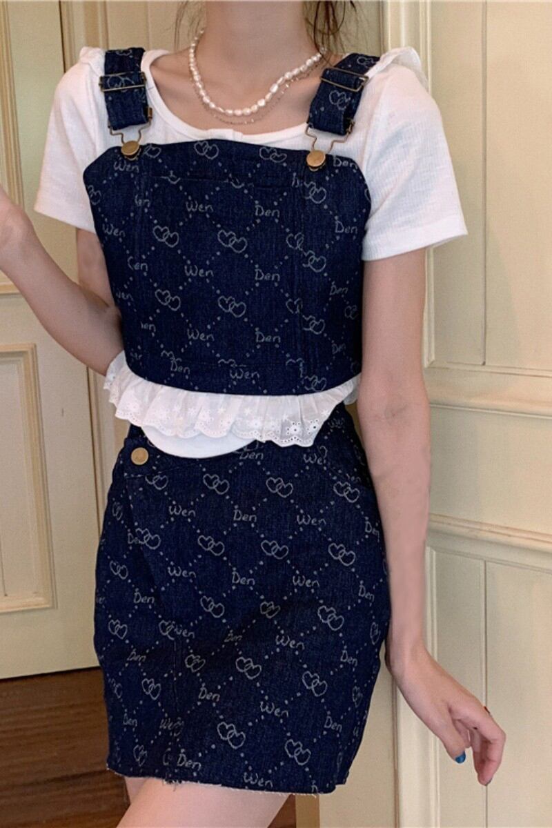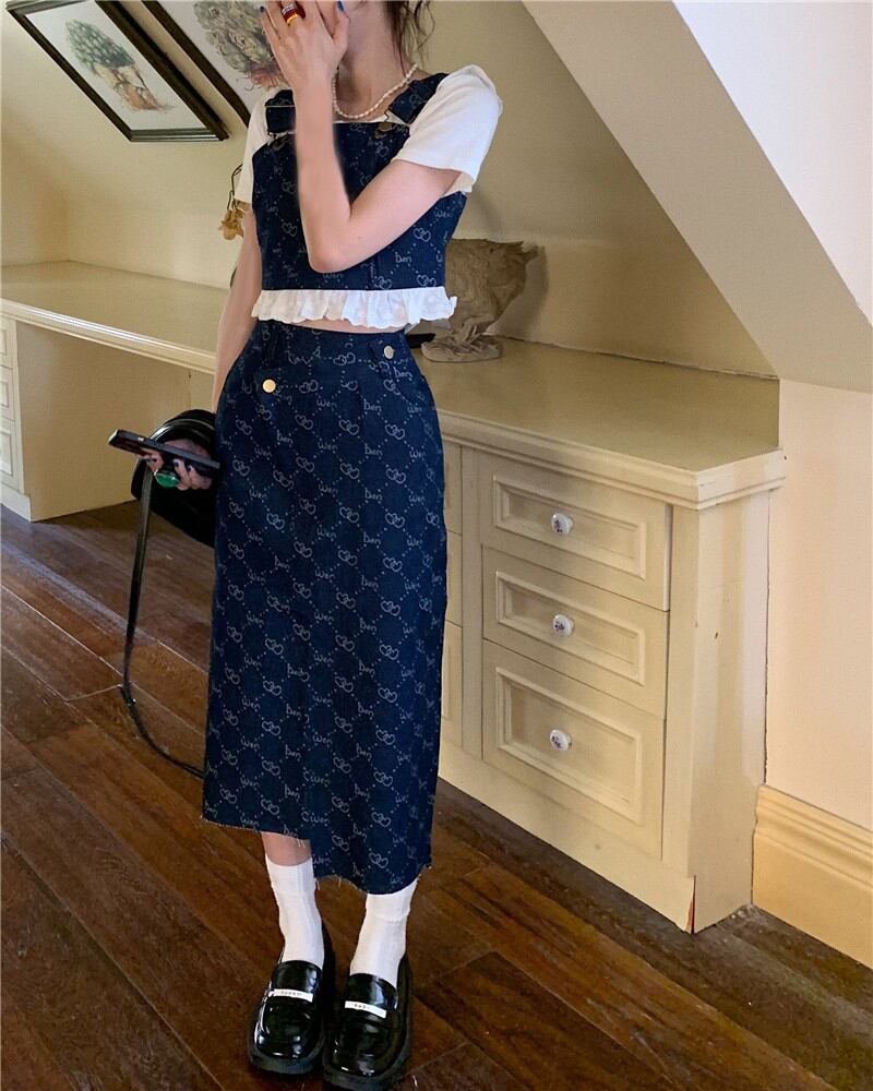 Hong Kong style retro denim fashion suit female summer 2022 new temperament lace edge suspender skirt two-piece レトロ レース サマー 夏物 スカート 0921914798947192