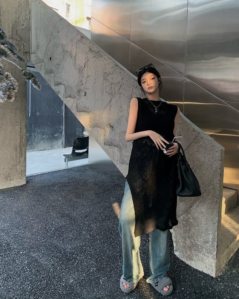 Hollow lace black vest dress women's summer 2022 new temperament waist mid-length slit skirt trendy ブラック レース サマー 夏物 スカート 0921952462533752