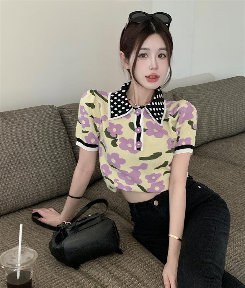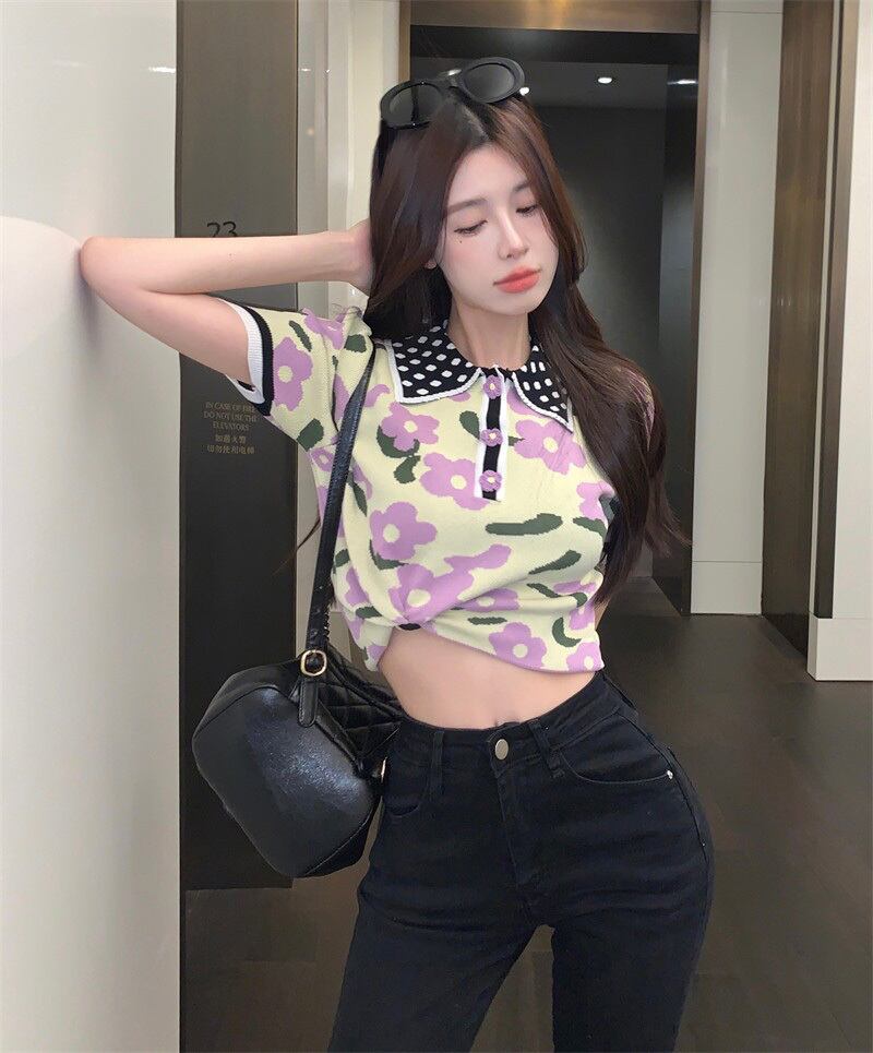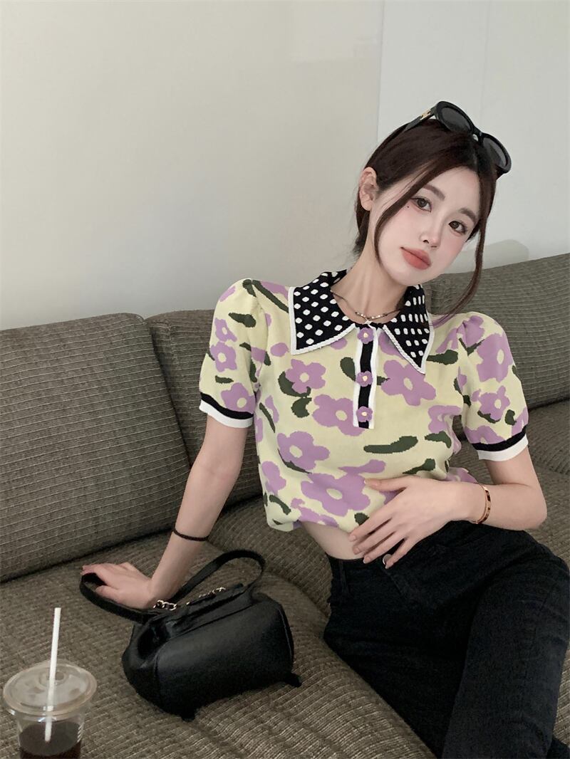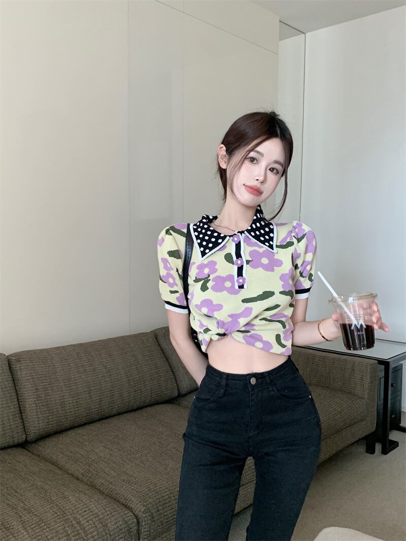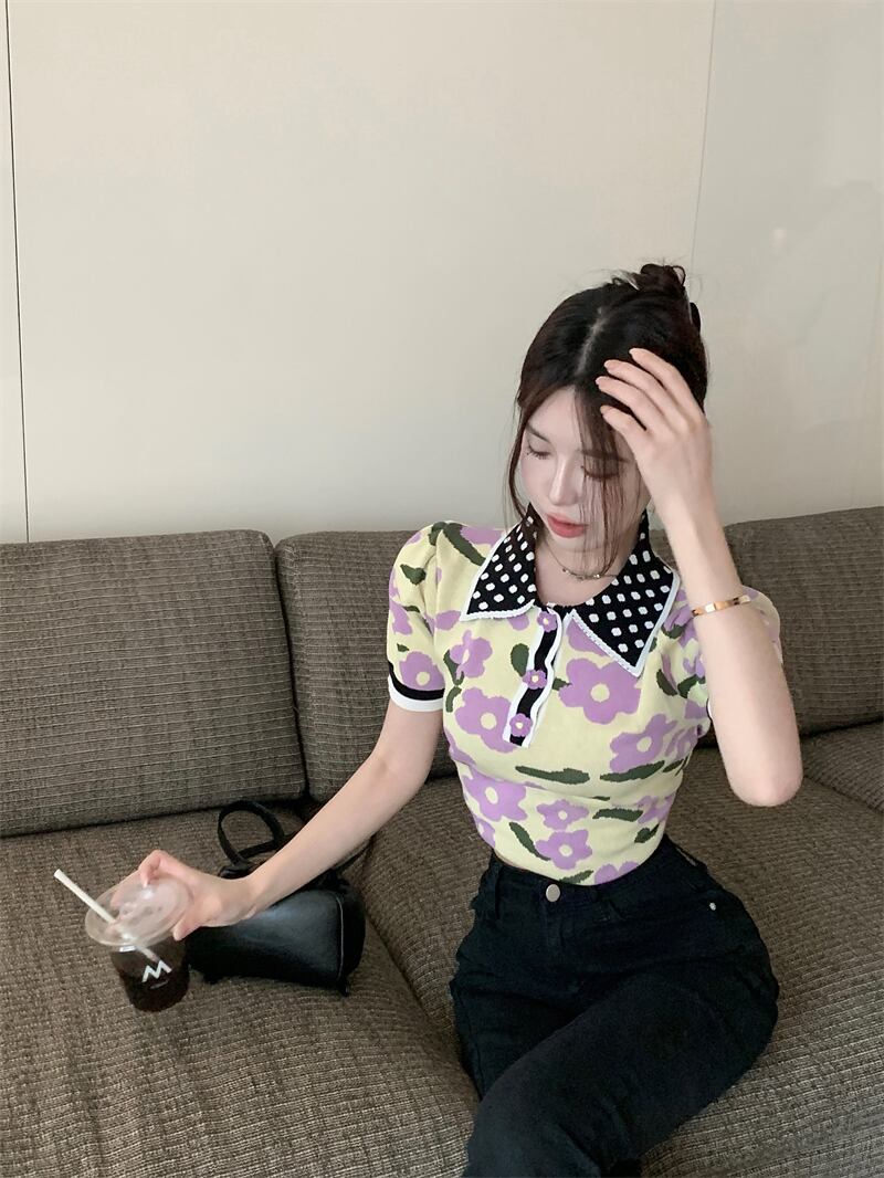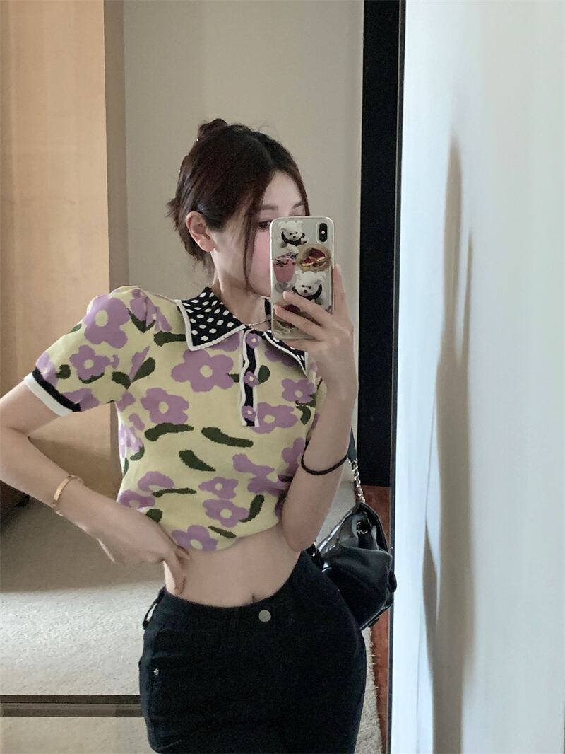Retro jacquard knitted short-sleeved t-shirt women's summer 2022 new design slim small fresh short top trendy ショート レトロ サマー 夏物 スリム Tシャツ 0921920889796642