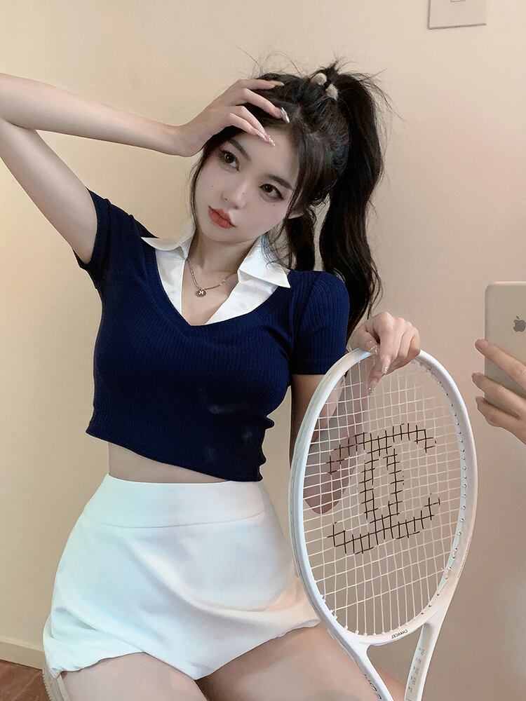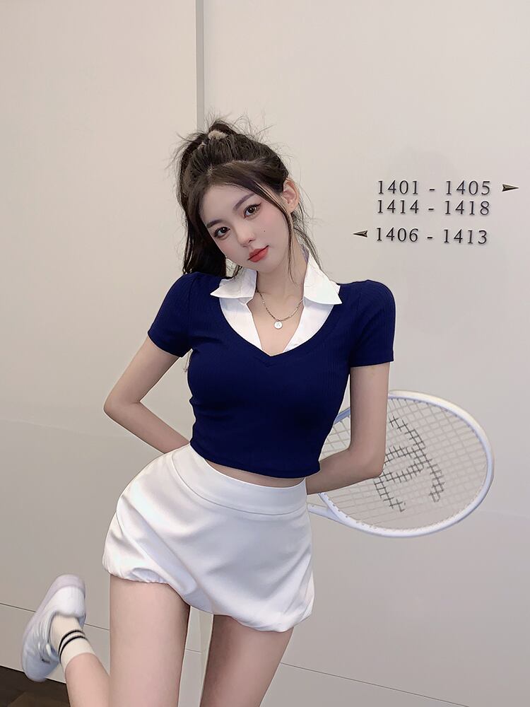 American retro contrast color polo collar stitching short-sleeved T-shirt women's summer 2022 new temperament short top ショート レトロ サマー 夏物 Tシャツ ステッチ 0921930484085062