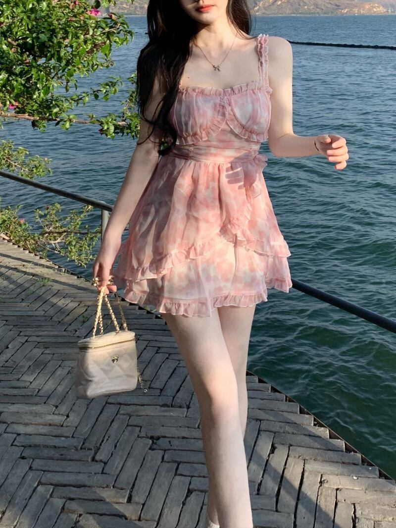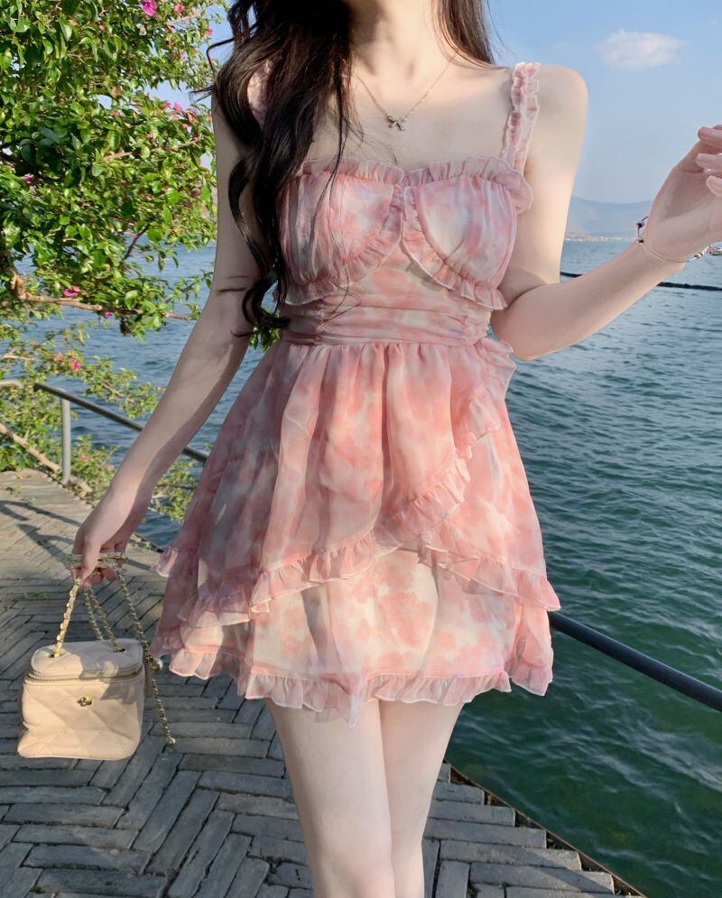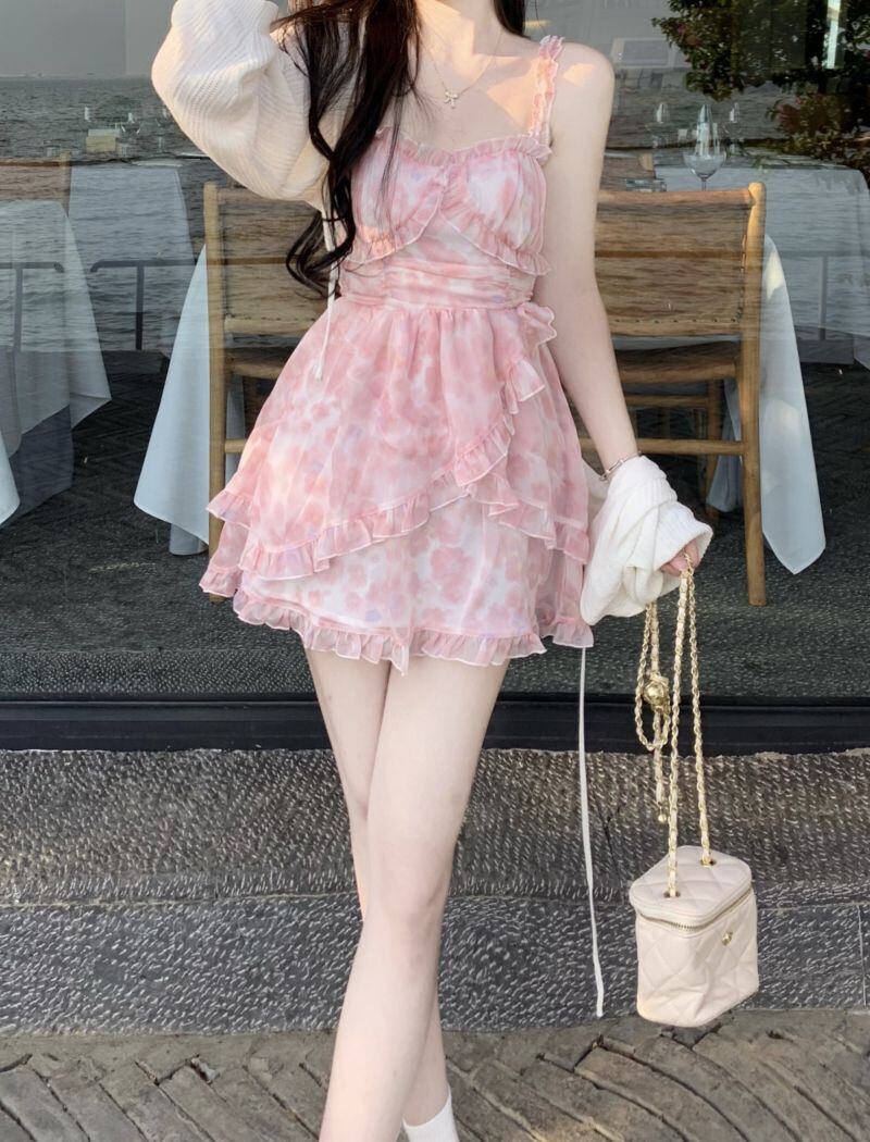 Sweet and spicy pink floral suspender dress women's summer 2022 new French fungus waist skirt ピンク 大人ガーリー スウィート キュート カジュアル サマー 夏物 花柄 スカート 092196754658919