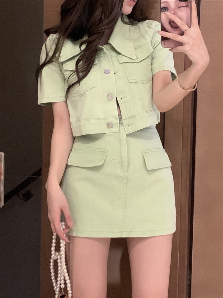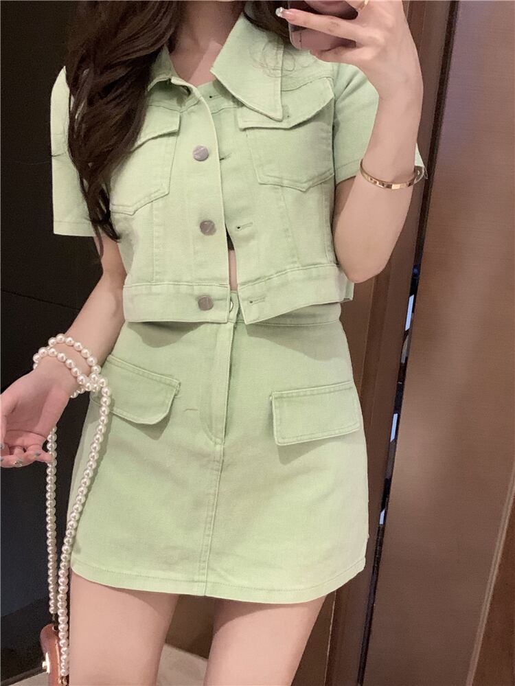 Sweet and spicy pink denim suit skirt women's summer 2022 new temperament short coat skirt two-piece tide ショート ピンク 大人ガーリー スウィート キュート カジュアル サマー 夏物 スカート 092191121489367