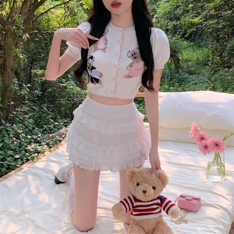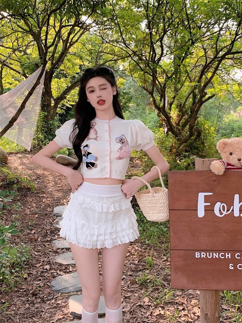 Sweet and spicy style chic bear short-sleeved knitted cardigan women's summer 2022 new age-reducing slim fit short top ショート 大人ガーリー スウィート キュート カジュアル カーディガン サマー 夏物 スリム 0921967727017776
