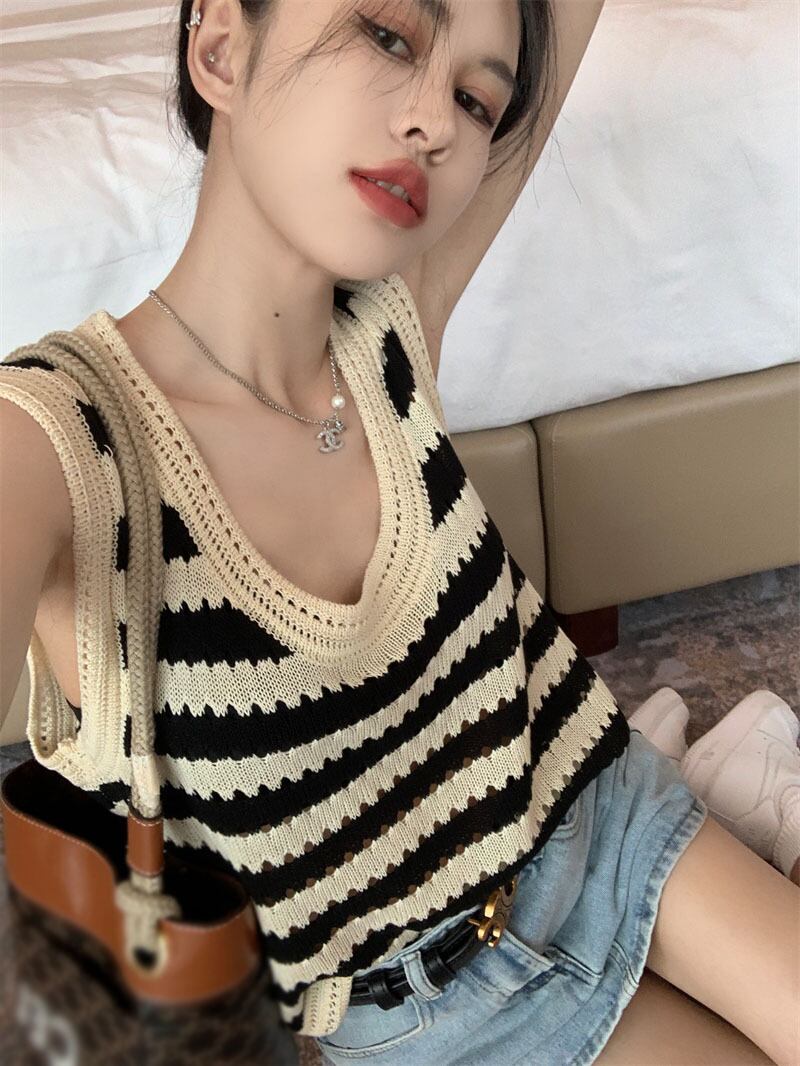 Lazy wind chic striped knitted vest women's outer wear summer 2022 new version of the temperament thin short top ショート サマー 夏物 ストライプ 0921936749976022