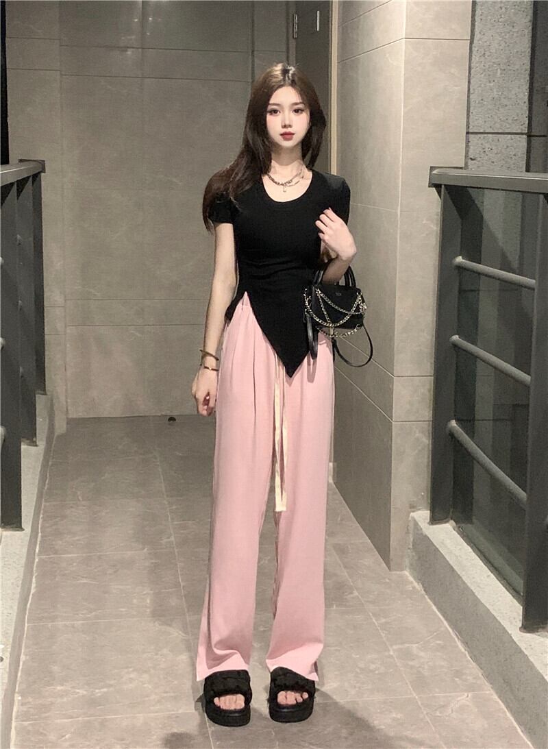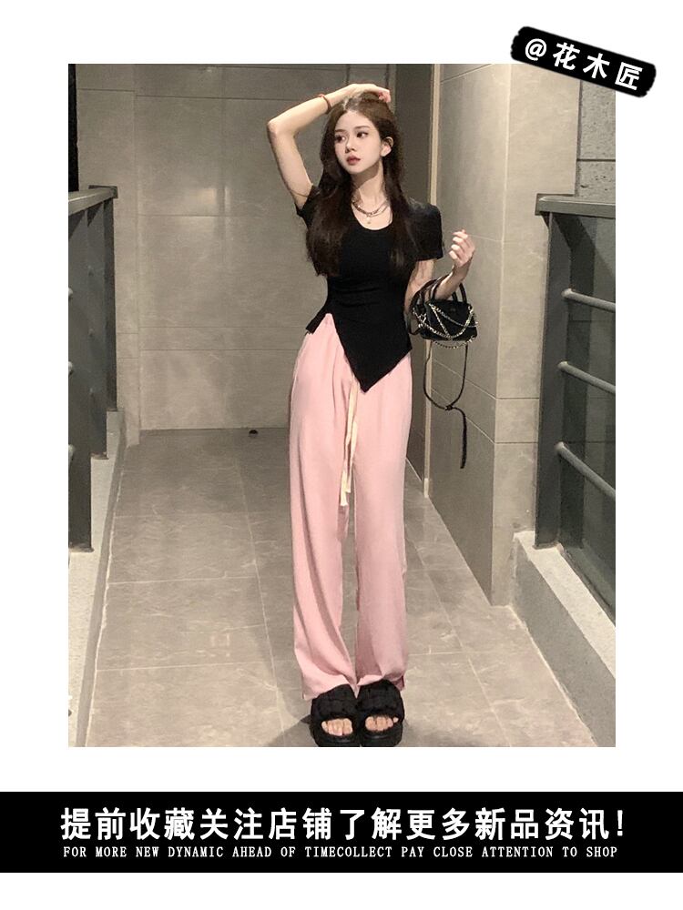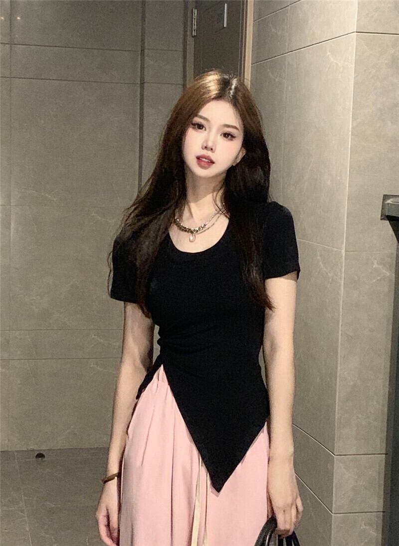 Hot black short-sleeved T-shirt women's summer 2022 new chic fashion slim slim irregular short top ショート ブラック サマー 夏物 スリム Tシャツ 0921985109177438