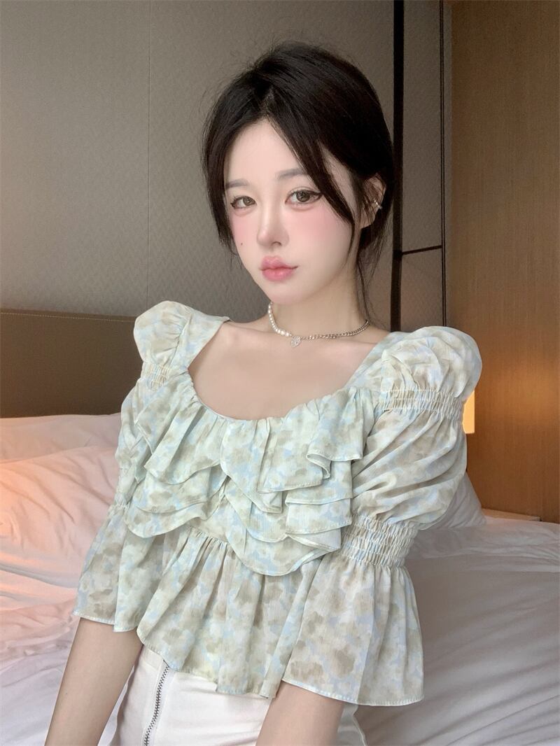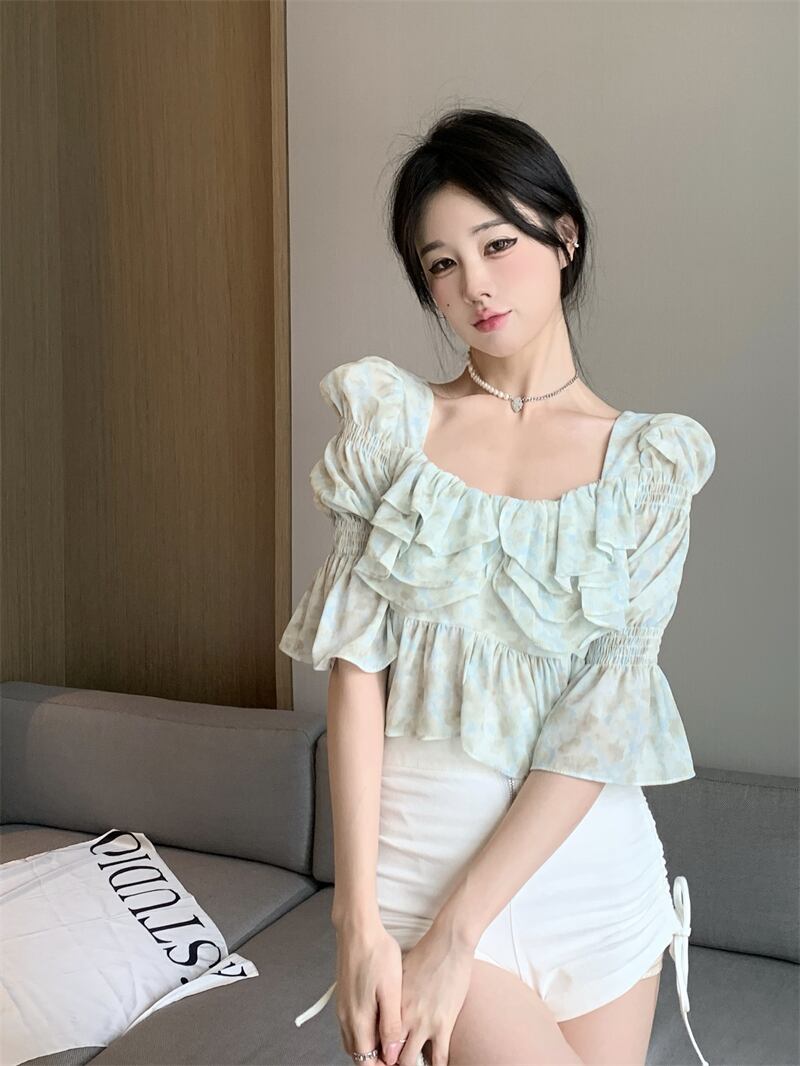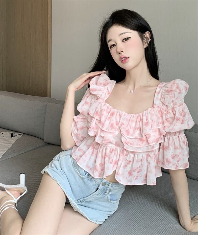 Sweet fairy pink floral chiffon top women's summer 2022 new square-neck trumpet-sleeved short waist shirt ショート ピンク シフォン 大人ガーリー スウィート キュート カジュアル サマー 夏物 花柄 スクウェア 092199170449361
