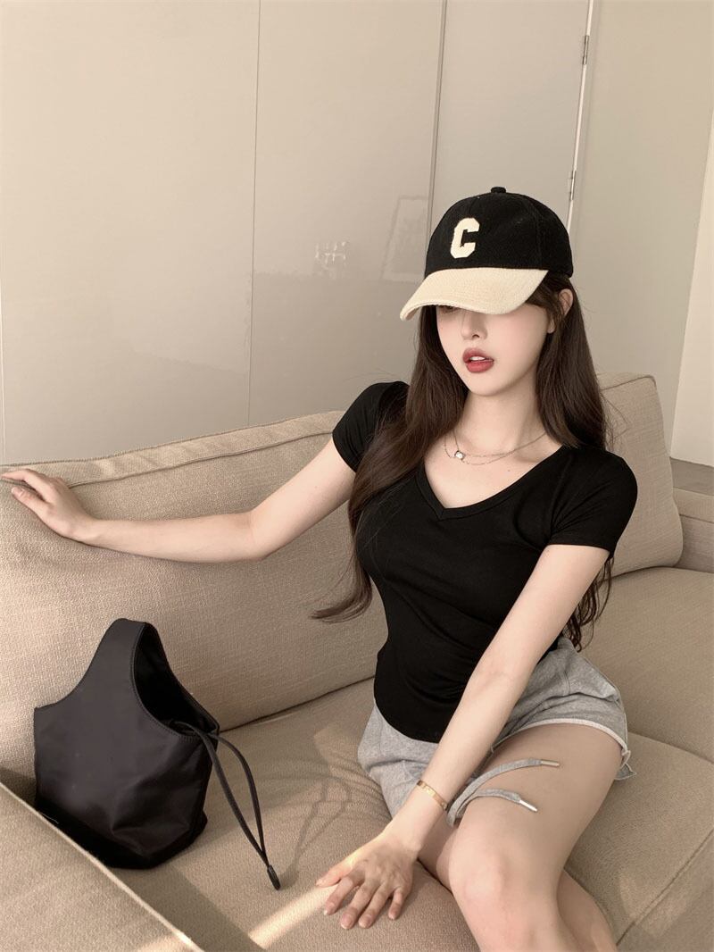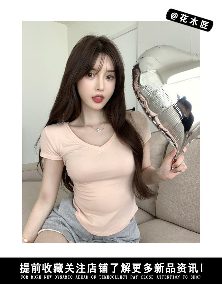 Western-style v-neck short-sleeved t-shirt women's ins tide summer 2022 new version of the wild slim slimming pure desire wind top サマー 夏物 Vネック スリム Tシャツ ピュア 0921945333596483