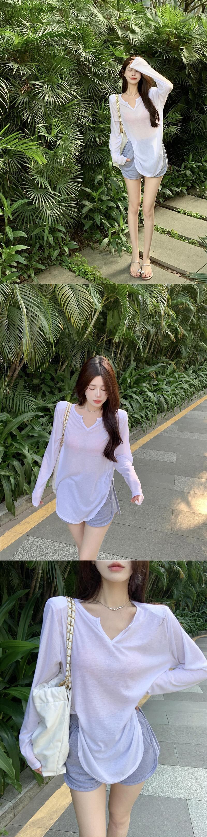 Western style thin section half-open collar sunscreen long-sleeved T-shirt women's summer 2022 new loose mid-length top ロング サマー 夏物 Tシャツ 0921995810682663