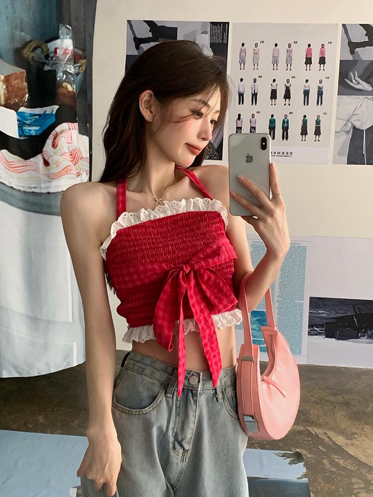 Sweet and spicy style chic fungus side halter vest women's outer wear summer 2022 new temperament bow short top ショート リボン 大人ガーリー スウィート キュート カジュアル サマー 夏物 0921914607266860