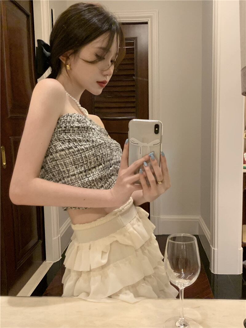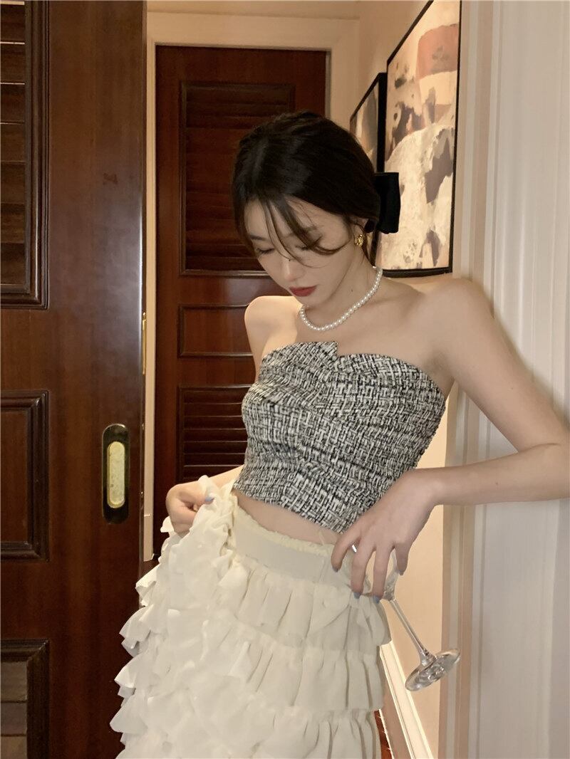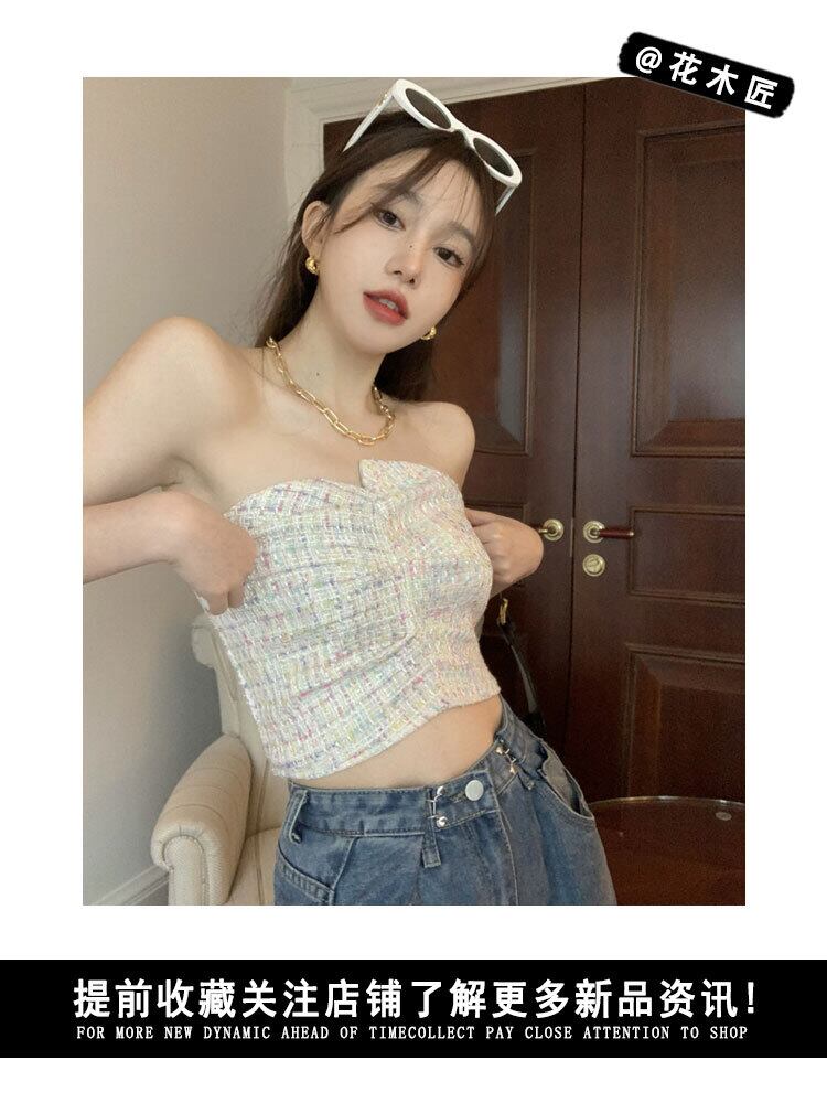 Tweed small fragrance tube top women's outer wear strapless summer 2022 new chic pleated slim short top ショート プリーツ サマー 夏物 スリム 0921987471987477
