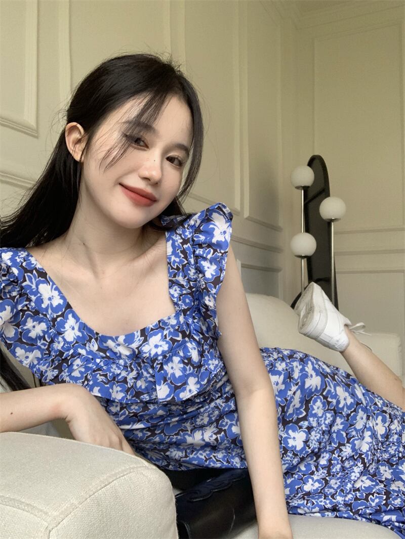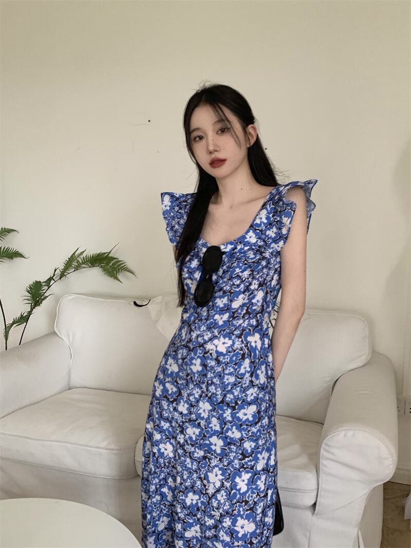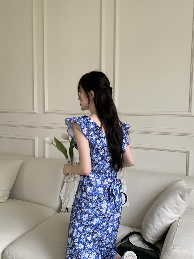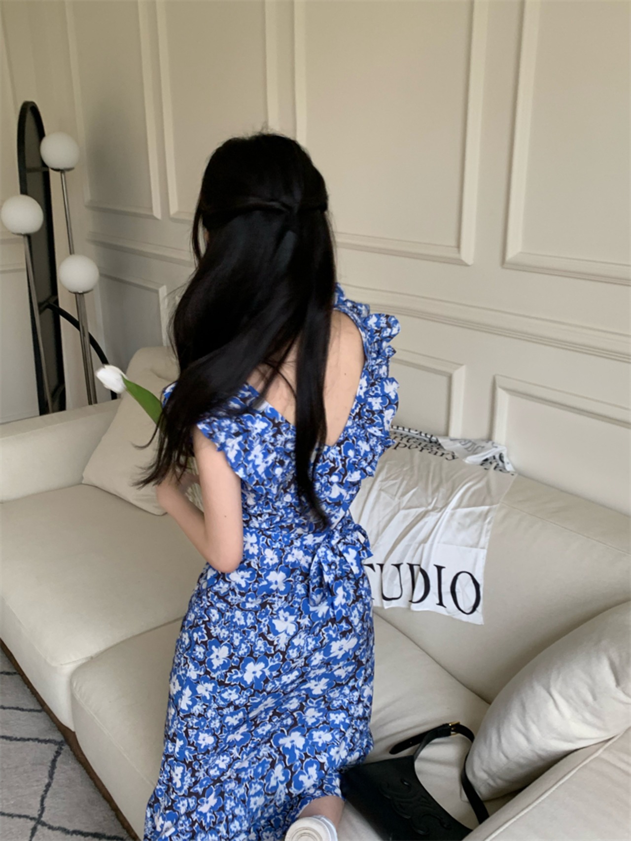 French Feifei Sleeve Blue Floral Dress Women's Summer 2022 Temperament Backless Waist Mid-Length Skirt ブルー サマー 夏物 花柄 スカート 0921968358516397