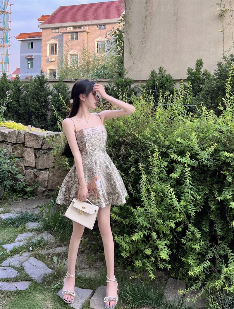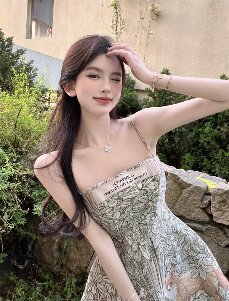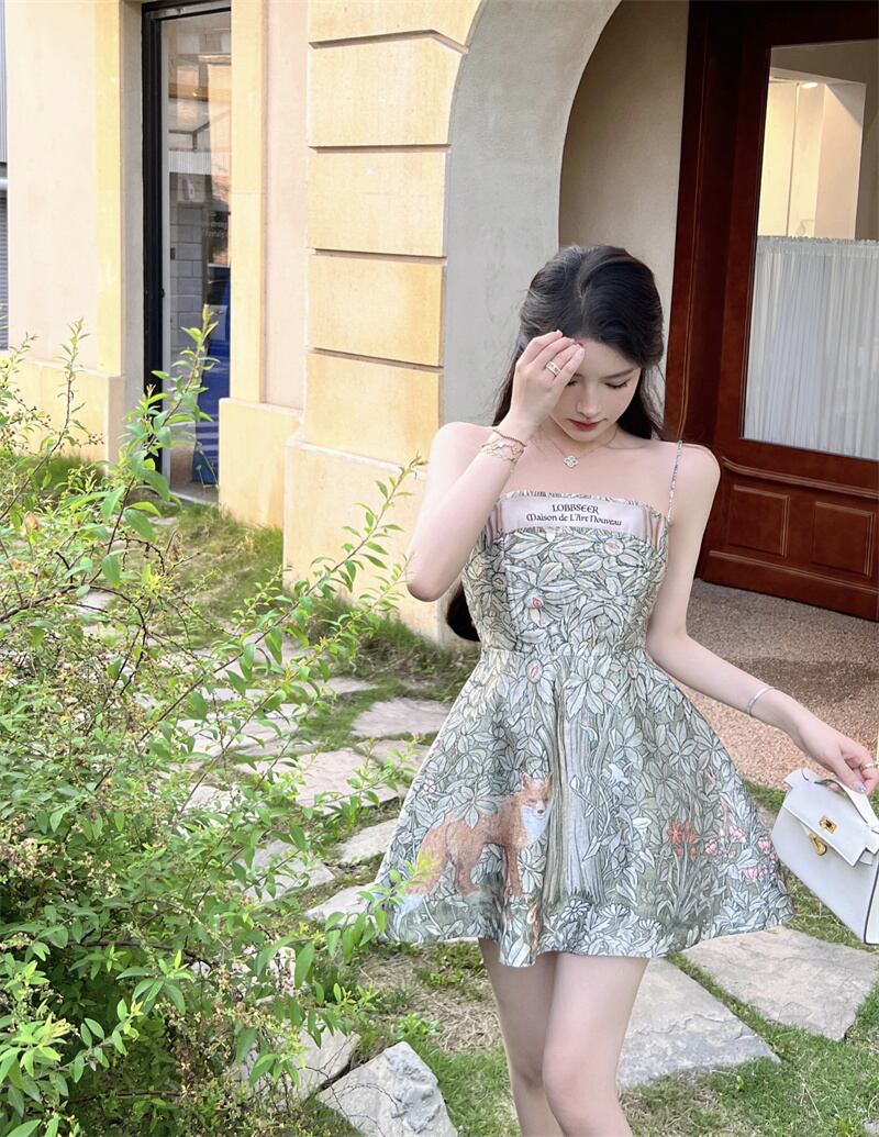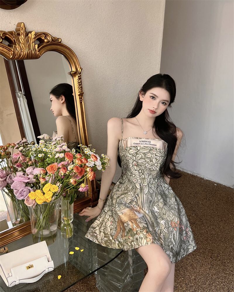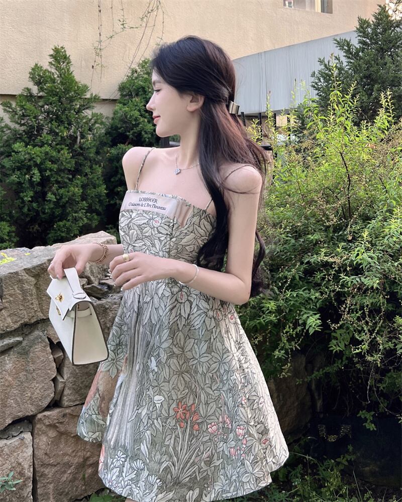Retro floral suspender dress women's summer 2022 new design sense patch letters waist thin a-line skirt レトロ サマー 夏物 花柄 スカート Aライン 0921941725186298