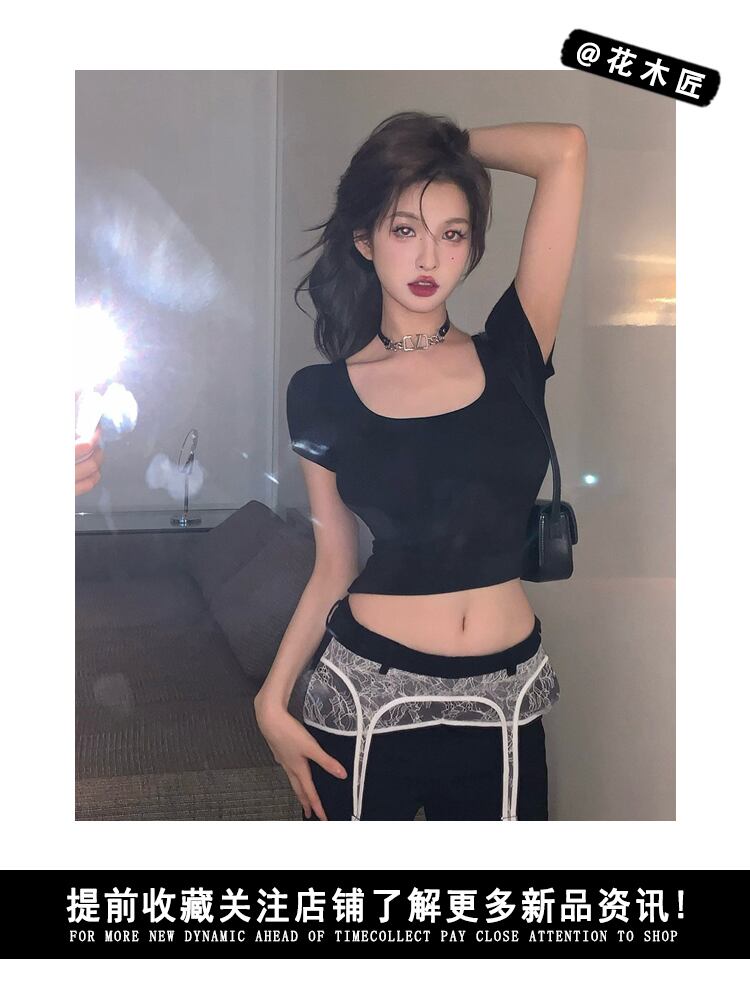 Sexy babes u-neck black short-sleeved t-shirt women's summer 2022 new all-match tight-fitting, thin, exposed navel pure desire top ブラック サマー 夏物 Tシャツ ピュア 092193024220262