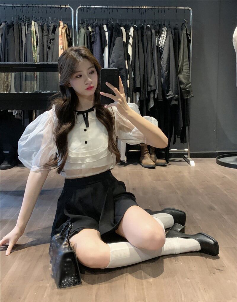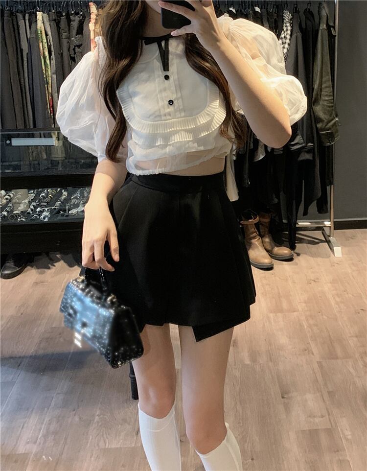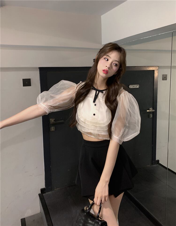 French sweet mesh puff sleeve shirt women's summer 2022 new high-end temperament slim short top trendy ショート 大人ガーリー スウィート キュート カジュアル サマー 夏物 メッシュ スリム 0921935117172694