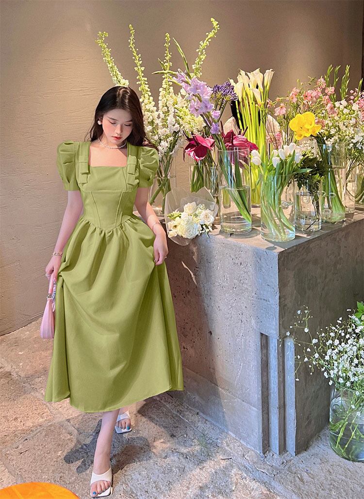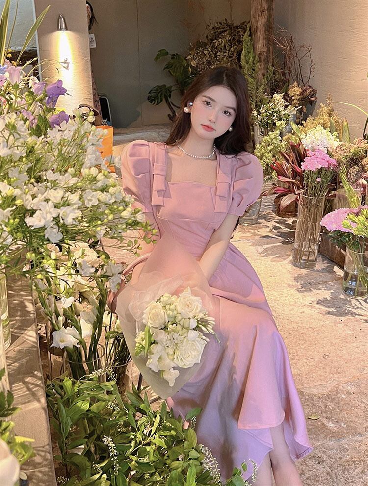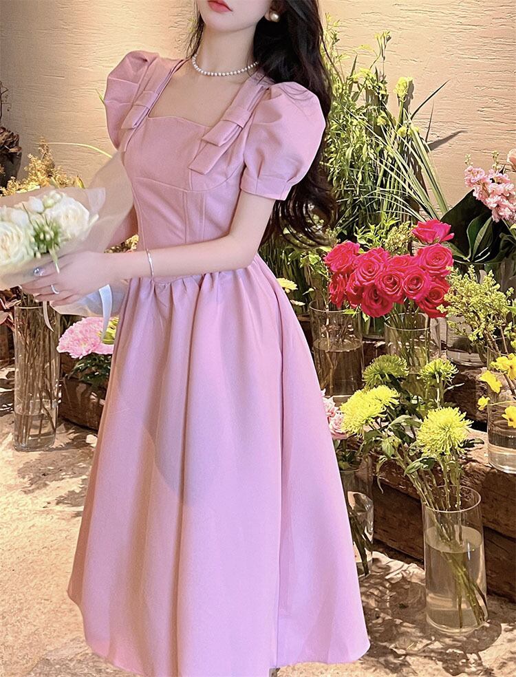 First love pink puff sleeve dress female summer 2022 new bow square neck waist mid-length a-line skirt ピンク リボン サマー 夏物 スカート Aライン スクウェア 0921972678324956