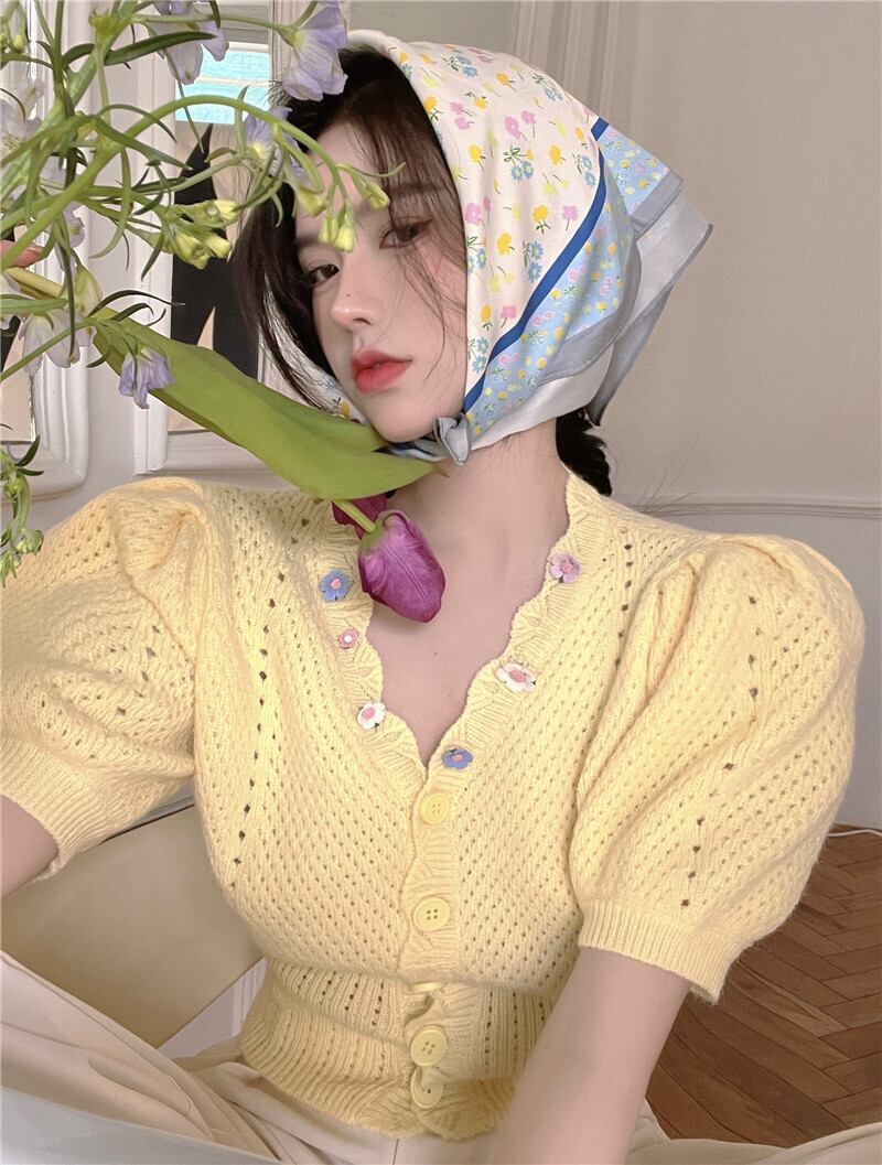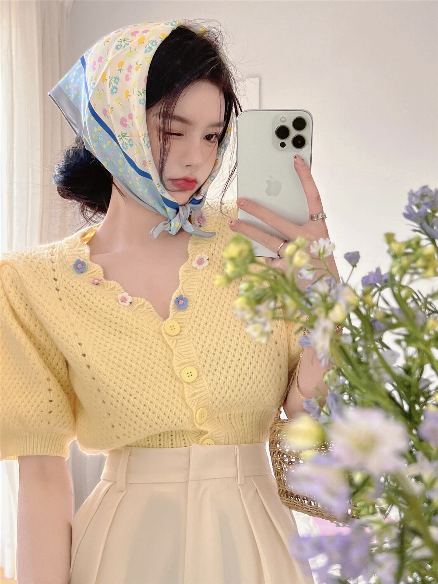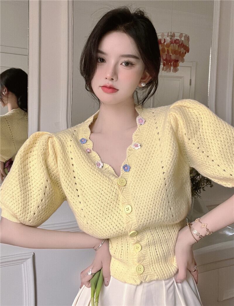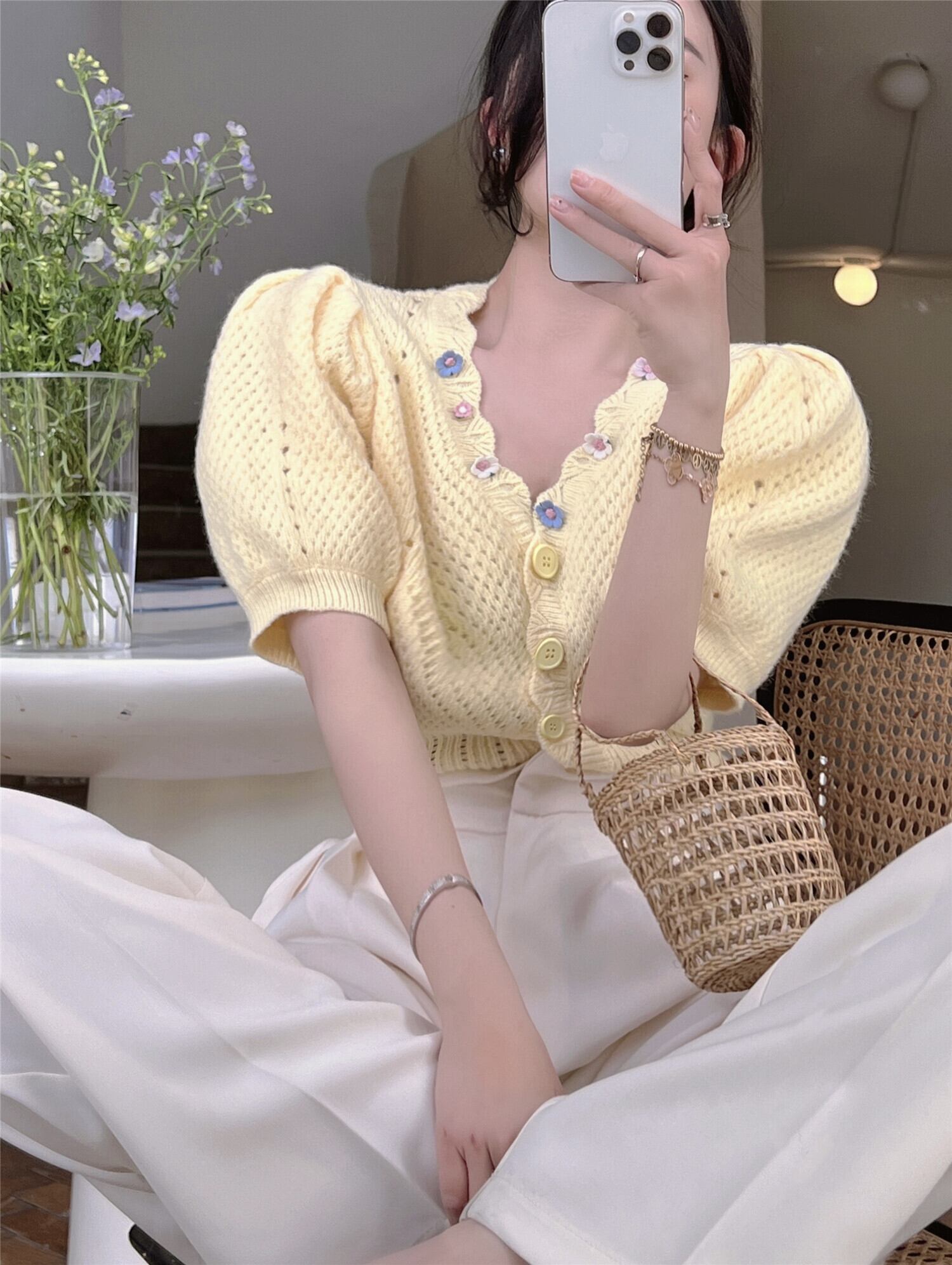 Salt-based sweet puff sleeves yellow V-neck knitted cardigan women's summer 2022 new gentle temperament short top ショート 大人ガーリー スウィート キュート カジュアル カーディガン サマー 夏物 Vネック 0921952617571127