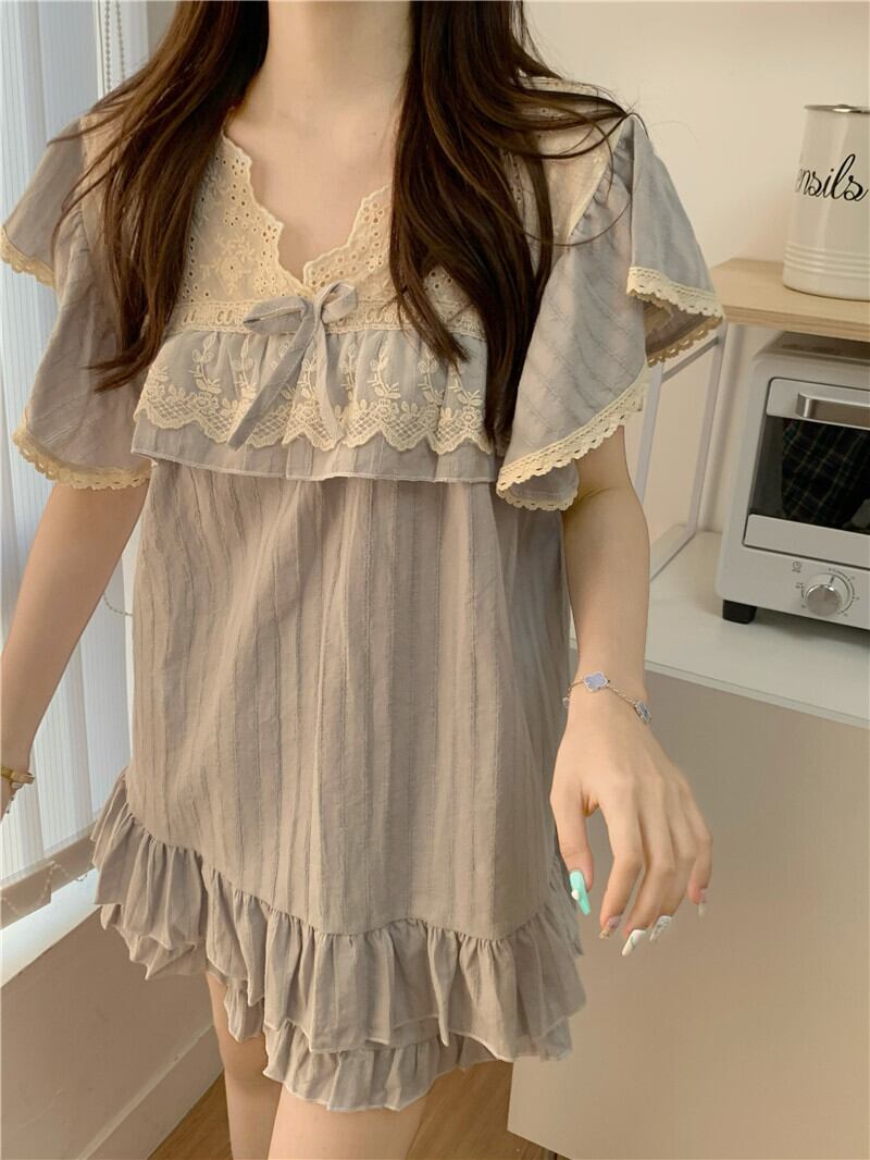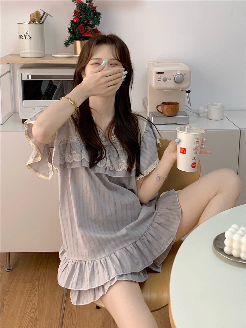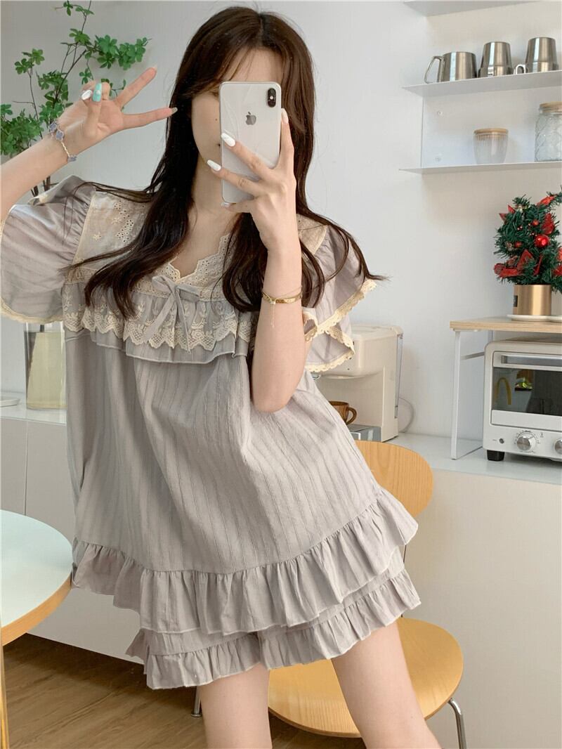 Court style lace jacquard short-sleeved pajamas pajamas suit women's summer 2022 new sweet home clothes two-piece suit レース 大人ガーリー スウィート キュート カジュアル サマー 夏物 0921944504856522