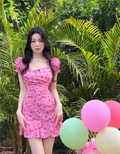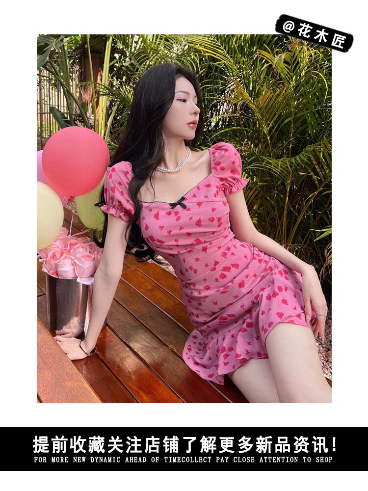 Sweet and spicy print puff sleeve dress women's summer 2022 new chic bow waist waist thin a-line skirt リボン 大人ガーリー スウィート キュート カジュアル サマー 夏物 スカート Aライン 0921917253341401